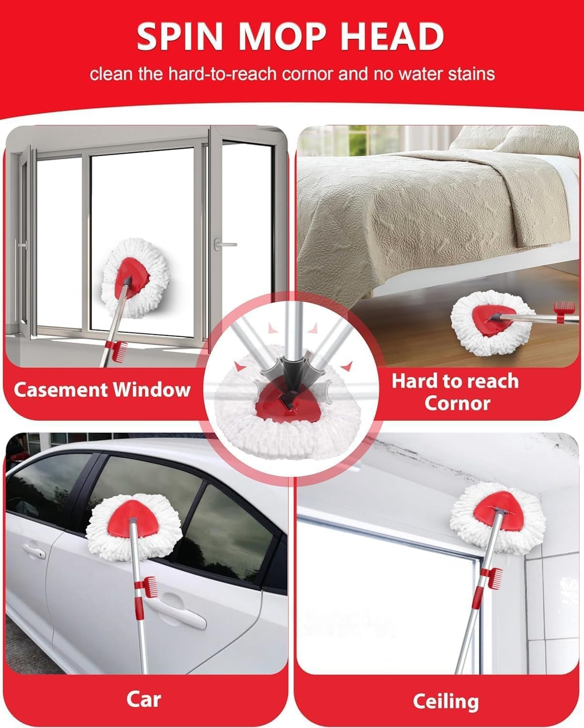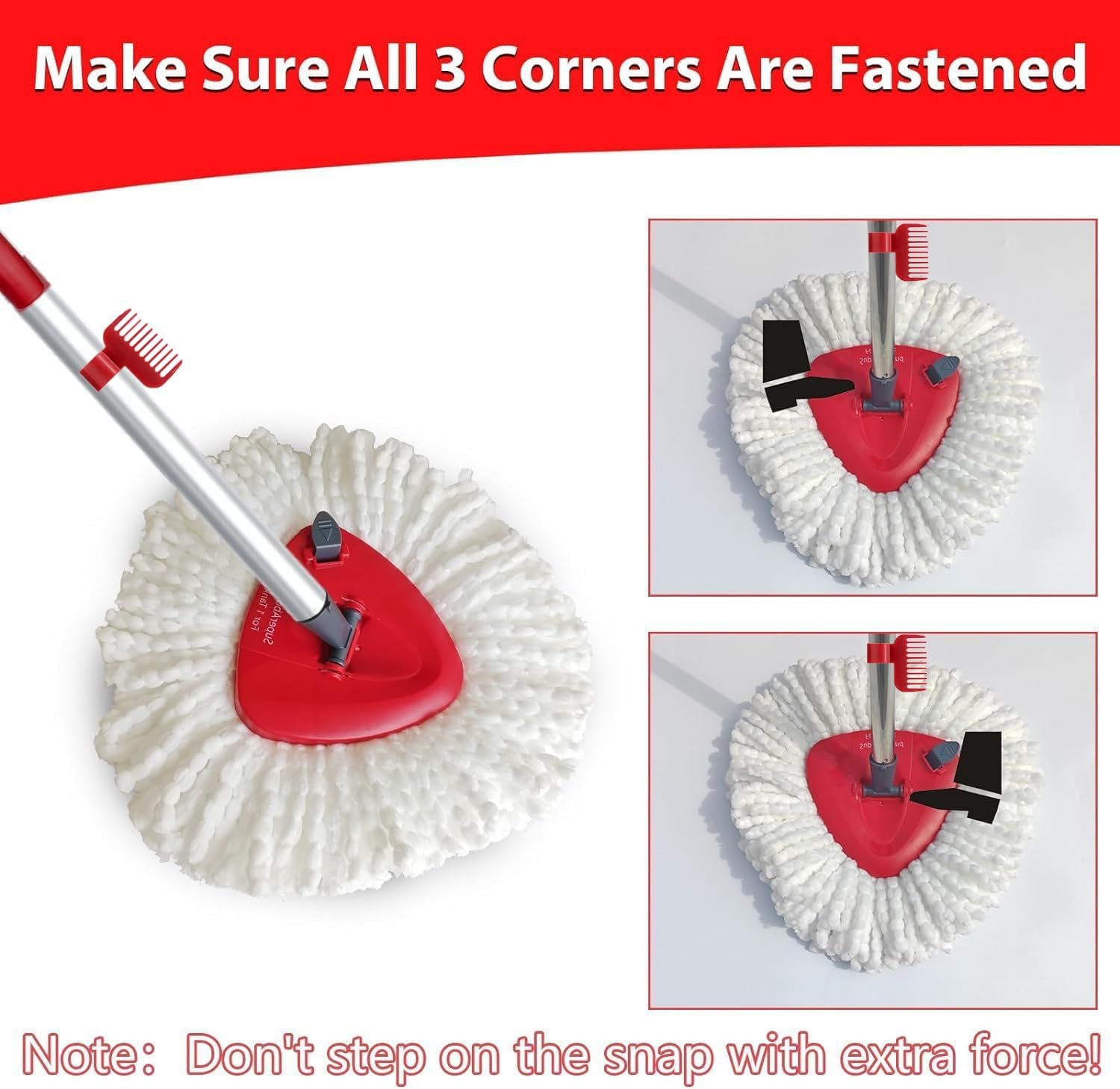 【Easy to Install】: Replacement Head/Brush and Base snap together, very solid, just remove the dirty mop head and snap the new spin mop refill into the triangular mop base, after you hear a “click”, it means the replacement is successful