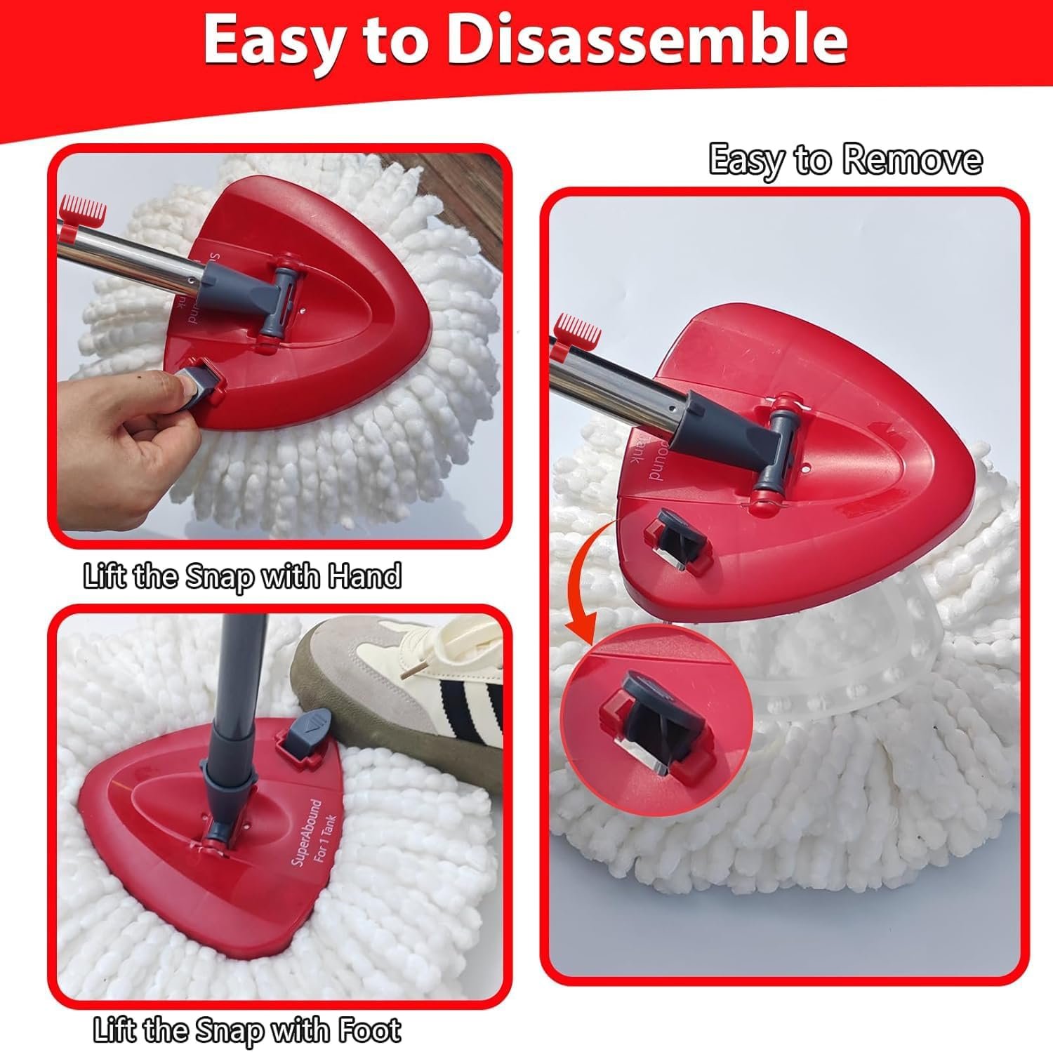 【Mop Base with Snap Design】: Snap design helps you to remove the spin mop head or scrub brush in one click. Makes replacement easier and more hygienic