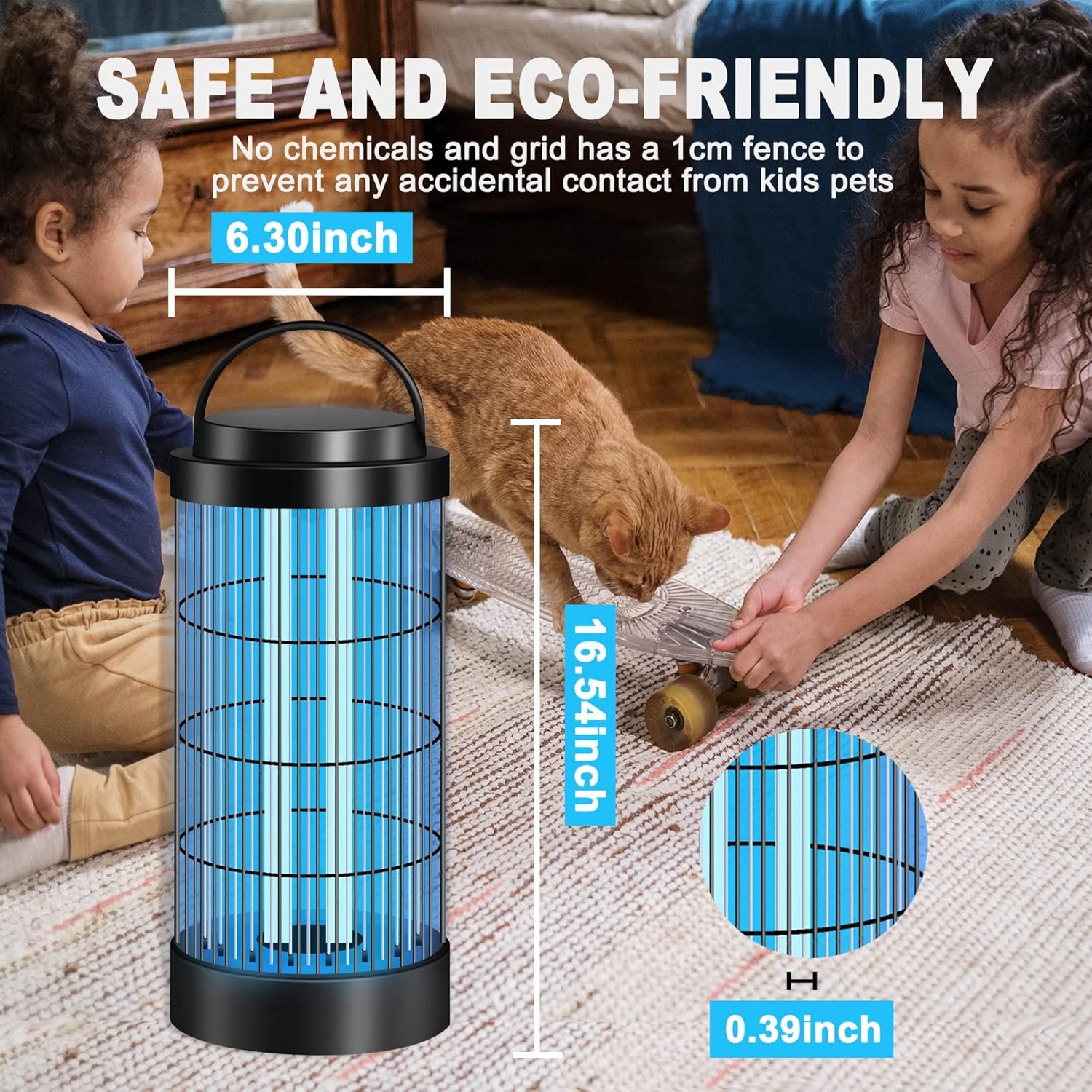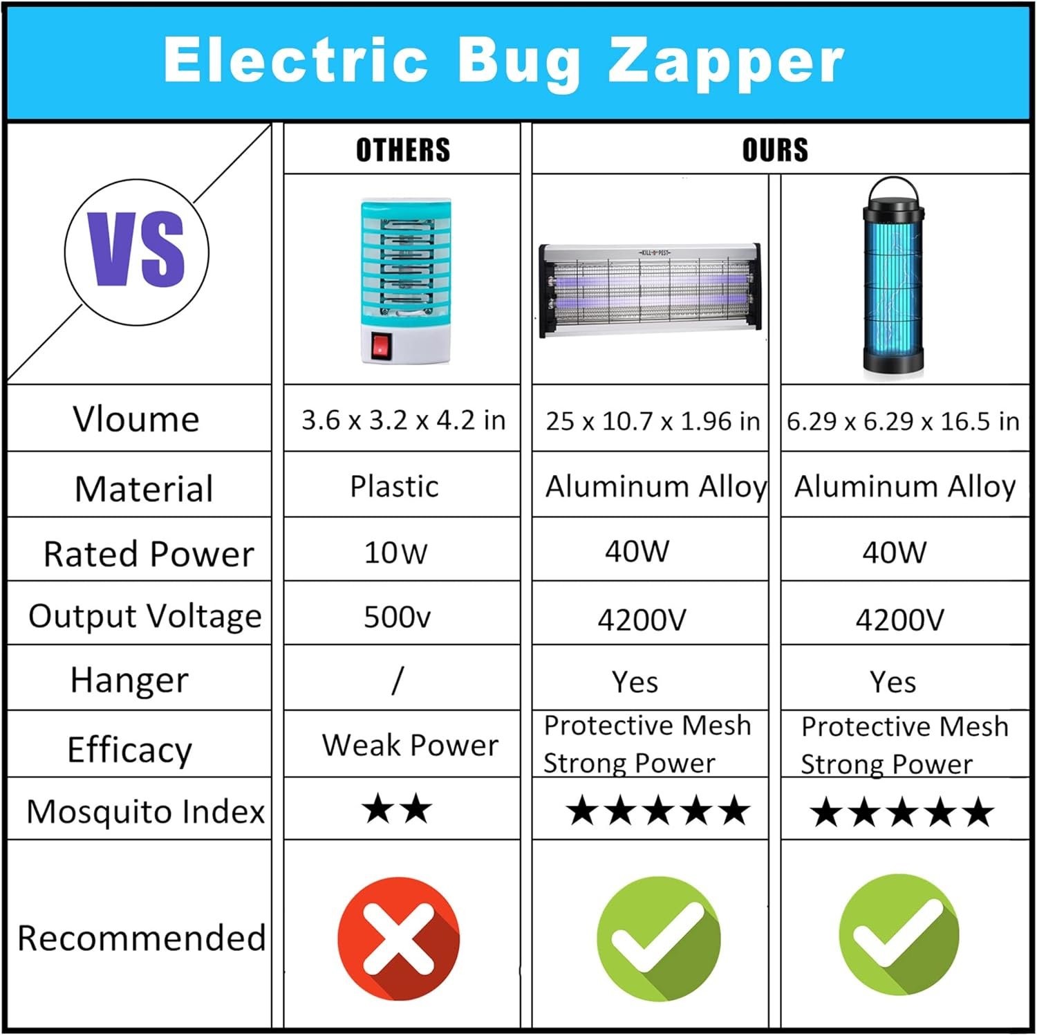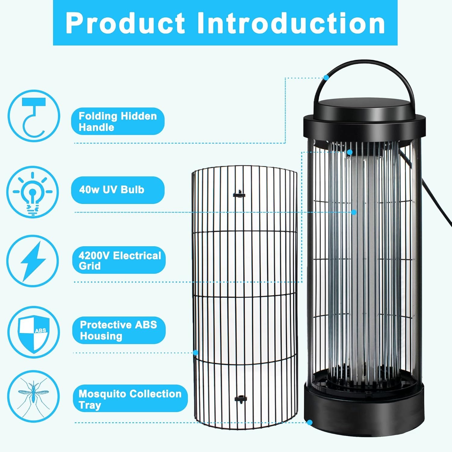 Emits 365-400nm ultraviolet light to attract most of the flying insect, especialy mosquitoes and flies.40W, the powerful bug zapper light tube (2*20W) has a life of 8000 hours and can be replaced if necessary4200 volts of power with UV light that attracts and kills flying insectsPerfect for medium to large areas about: 1100 sq ft /100-120m²Ultra-safe ABS Heat-resistant outer grid.Twist-off bug tray allow for easier clean-up.Hanging handle and chain for easy carryingSide switch design