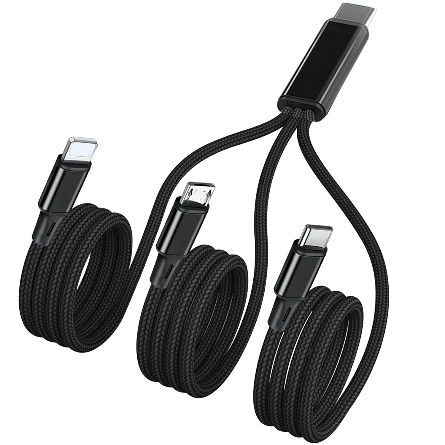 【3 in 1 Lightnning + Type C + Micro Cable】USB-C to Lightnning + Type C + Micro charging cable, One USB C port can power three devices at once, Type C prot: Sam sung Galaxy S24/ S23/ S22/ S21, Android Cell Phones, Tablets, PS5 control, Cameras. Lightnning prot: i-Phone 14/ 13/ 12, iPad Pro/Air/Mini, Micro prot: Samsung Galaxy S6/ S7 Amazon kindle fire, power banks.