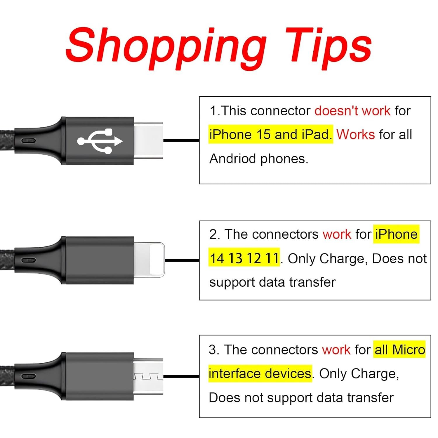 【Portable Fast Charging】You can take the Charging cable wire to anywhere, perfect for travel and used in the office or car. Max 3A fast charging. Support charge 3 devices at the same time. 【Updated 3-in-1 Multi Charger Cord】1x4ft cable length, play games with family and friends without interference.