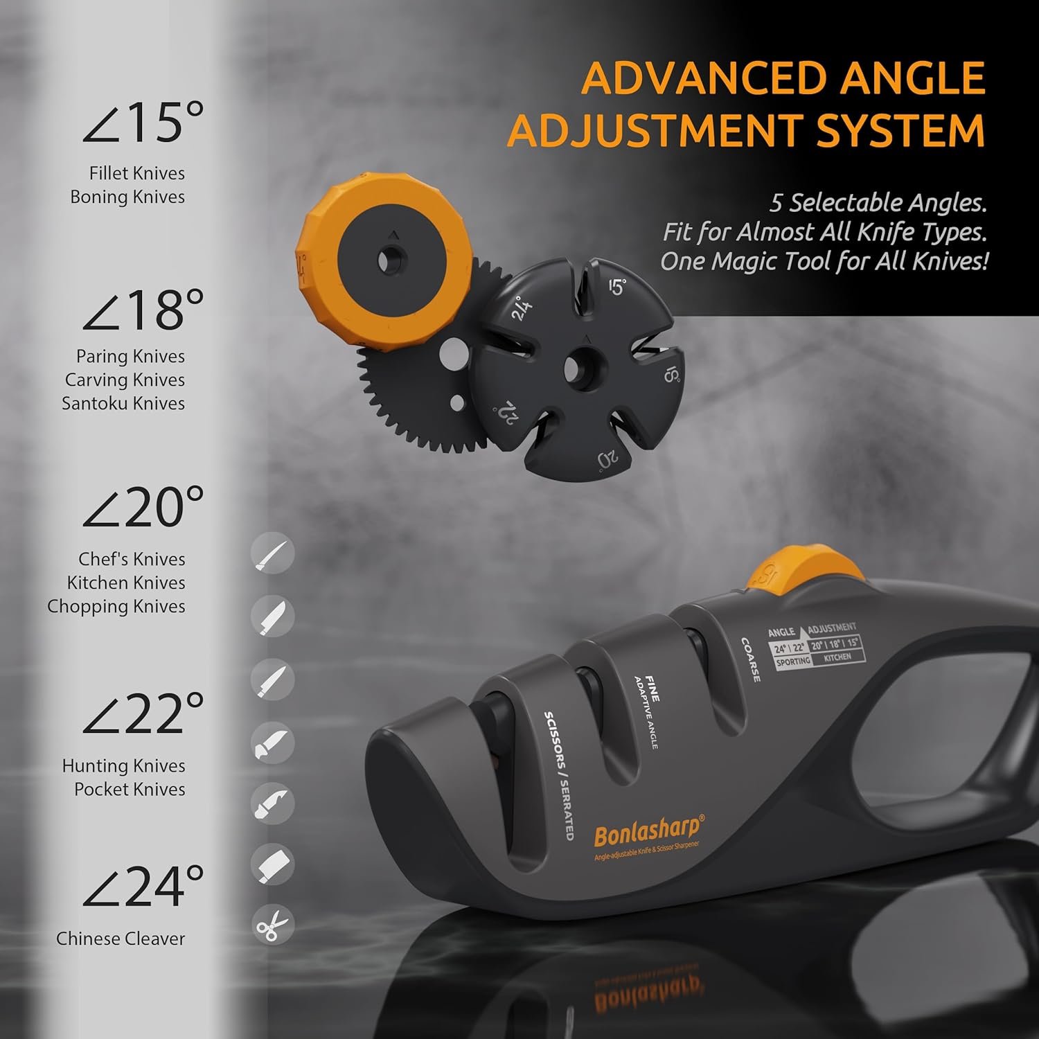 Precision Sharpening with 5 Adjustable Angles (15°-24°): Designed for a variety of knives, this sharpener allows you to easily adjust the angle for optimal performance. Whether you’re sharpening kitchen knives, scissors, or pocket knives, achieve the perfect edge every time.