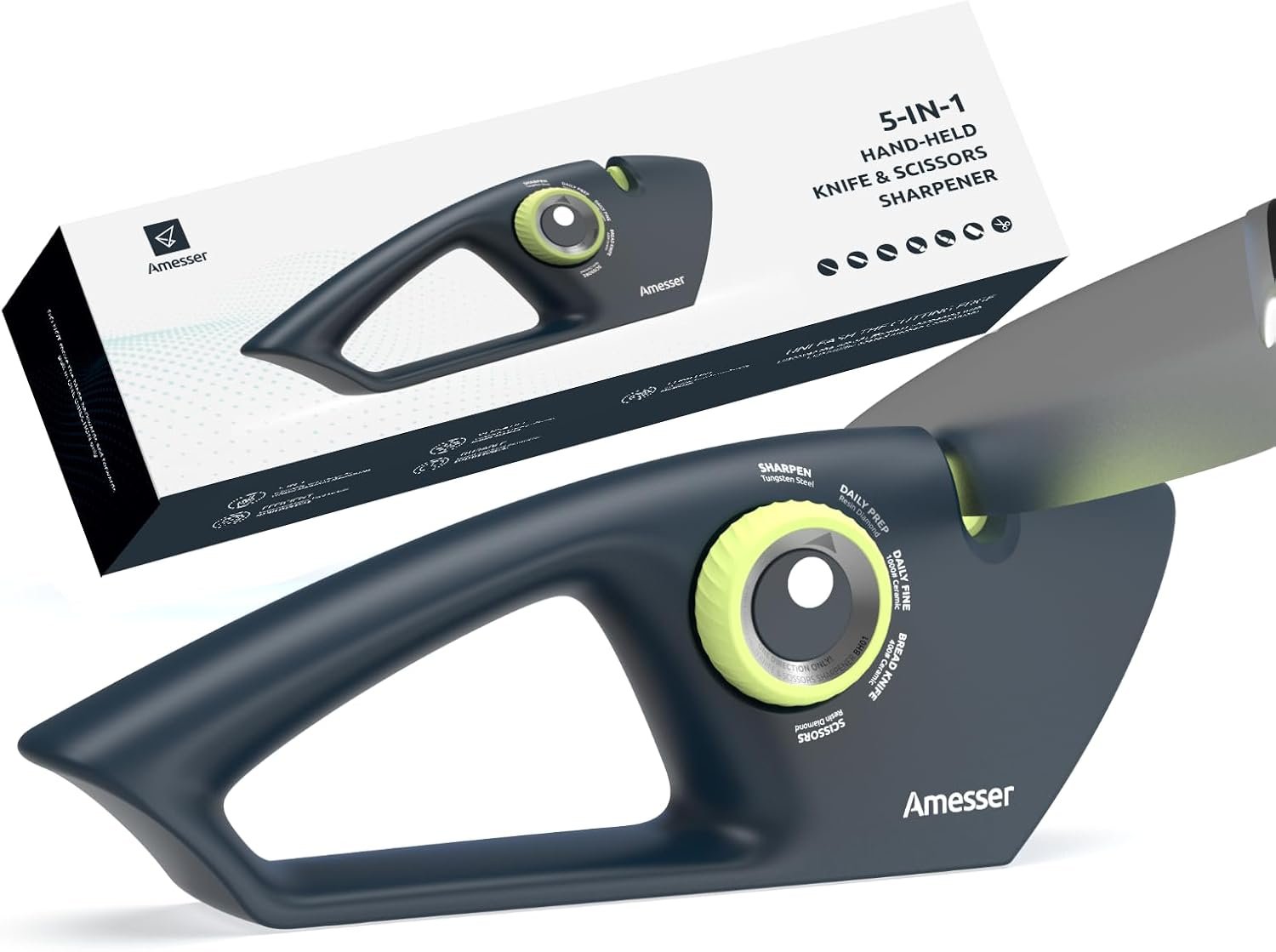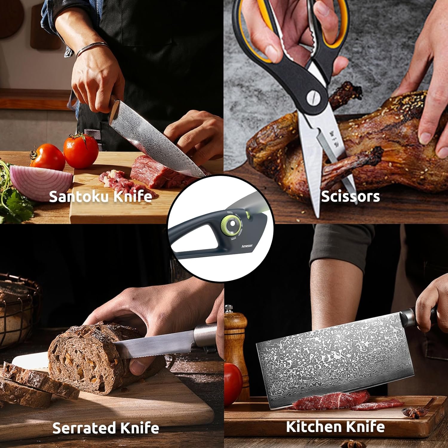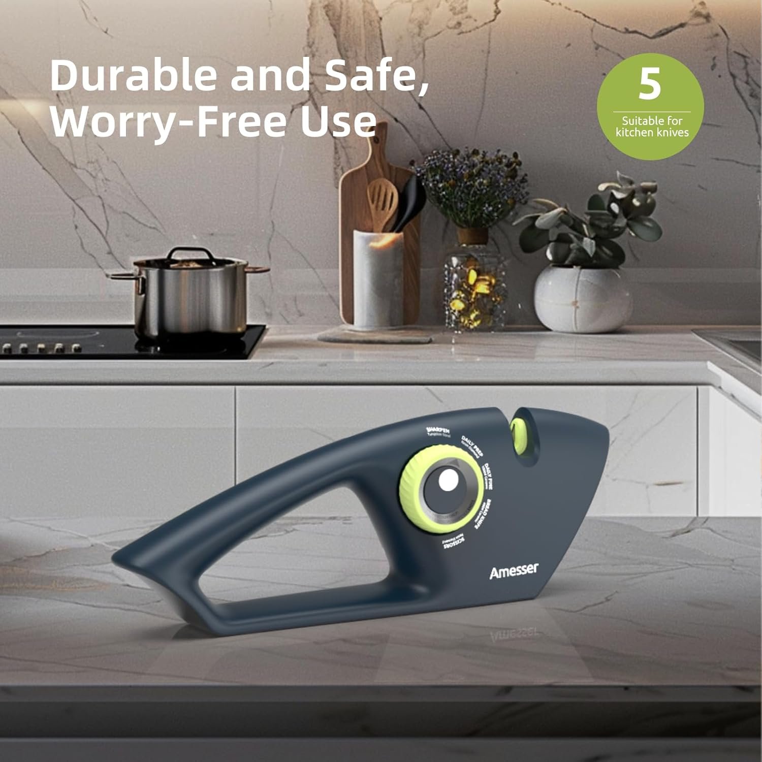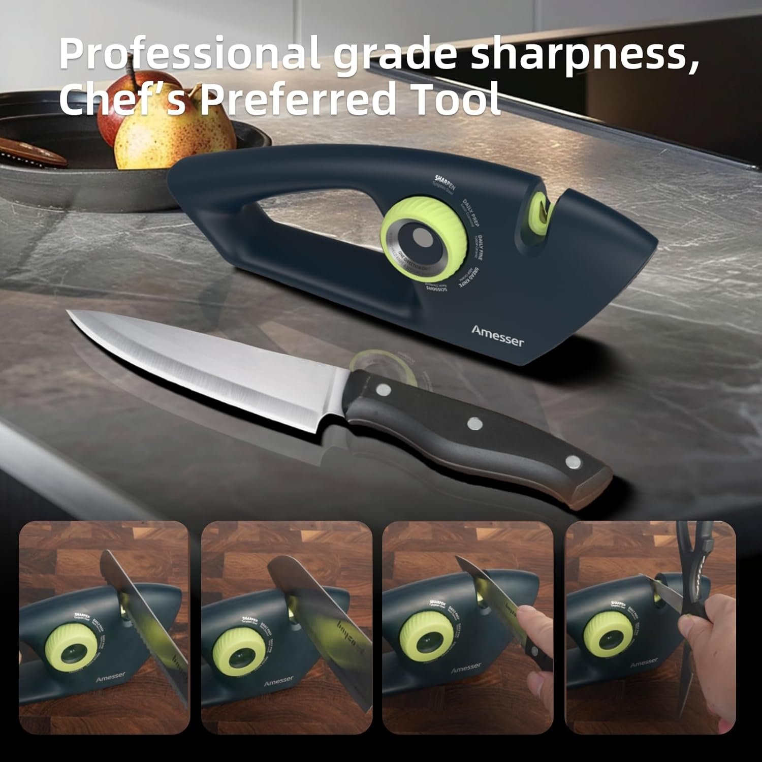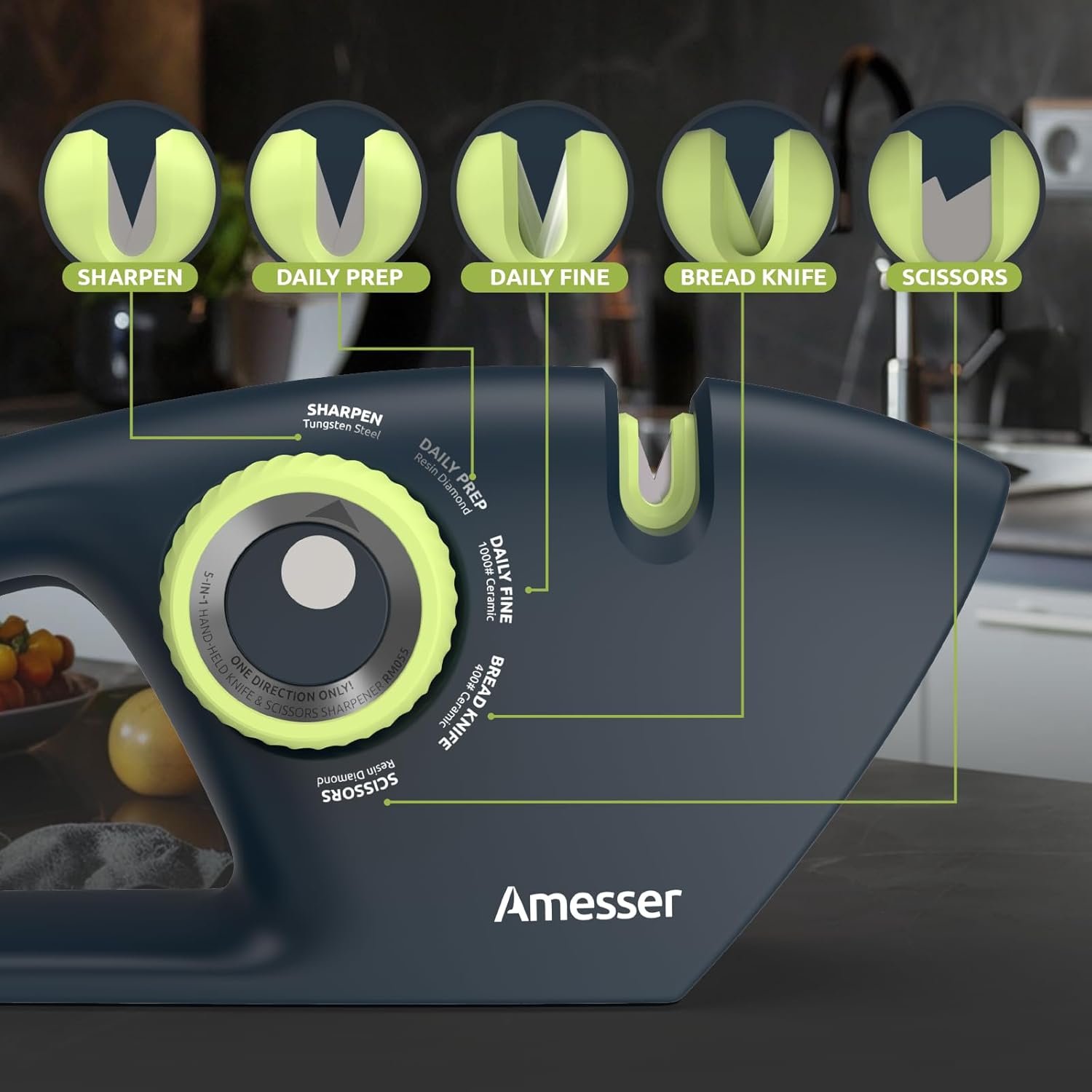 Versatile Design: The Amesser 5-in-1 Knife Sharpener easily sharpens, hones, and polishes various types of knives, including kitchen, pocket, serrated, bread knives, and scissors, meeting all your kitchen needs.