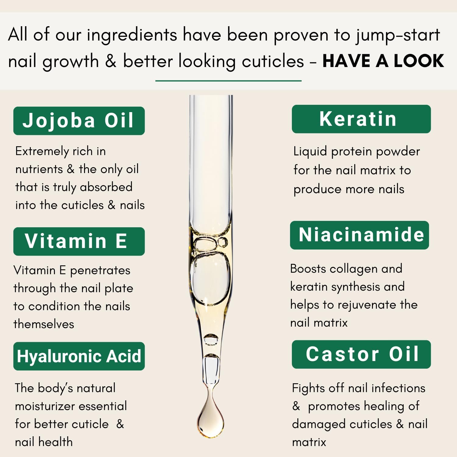 A Nail and Cuticle Oil and Serum that contains a concentrated amount of nutrients that will jump start your nail matrix to grow longer and stronger nails and make your cuticles look healthier. It contains Jojoba oil, Keratin, Hyaluronic acid, Niacinamide, Castor oil & Vitamin E oil.