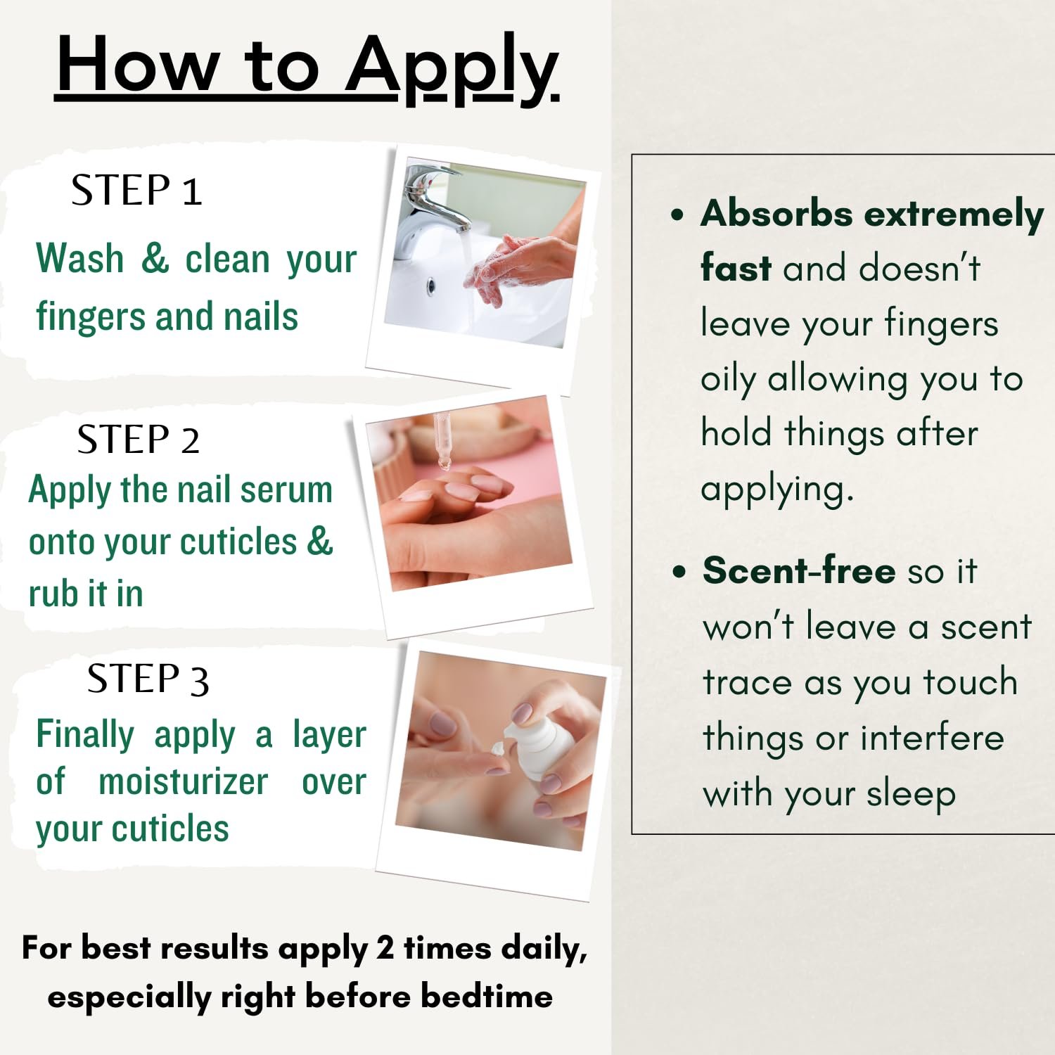 【Perfect Overnight Cuticle & Nail Oil】 – This is because of its rapid absorption and scent-free nature so it won’t mess up your sheets or interfere with your sleep. To use just rub the serum into your cuticle and then apply a moisturizer over them, right before going to bed.