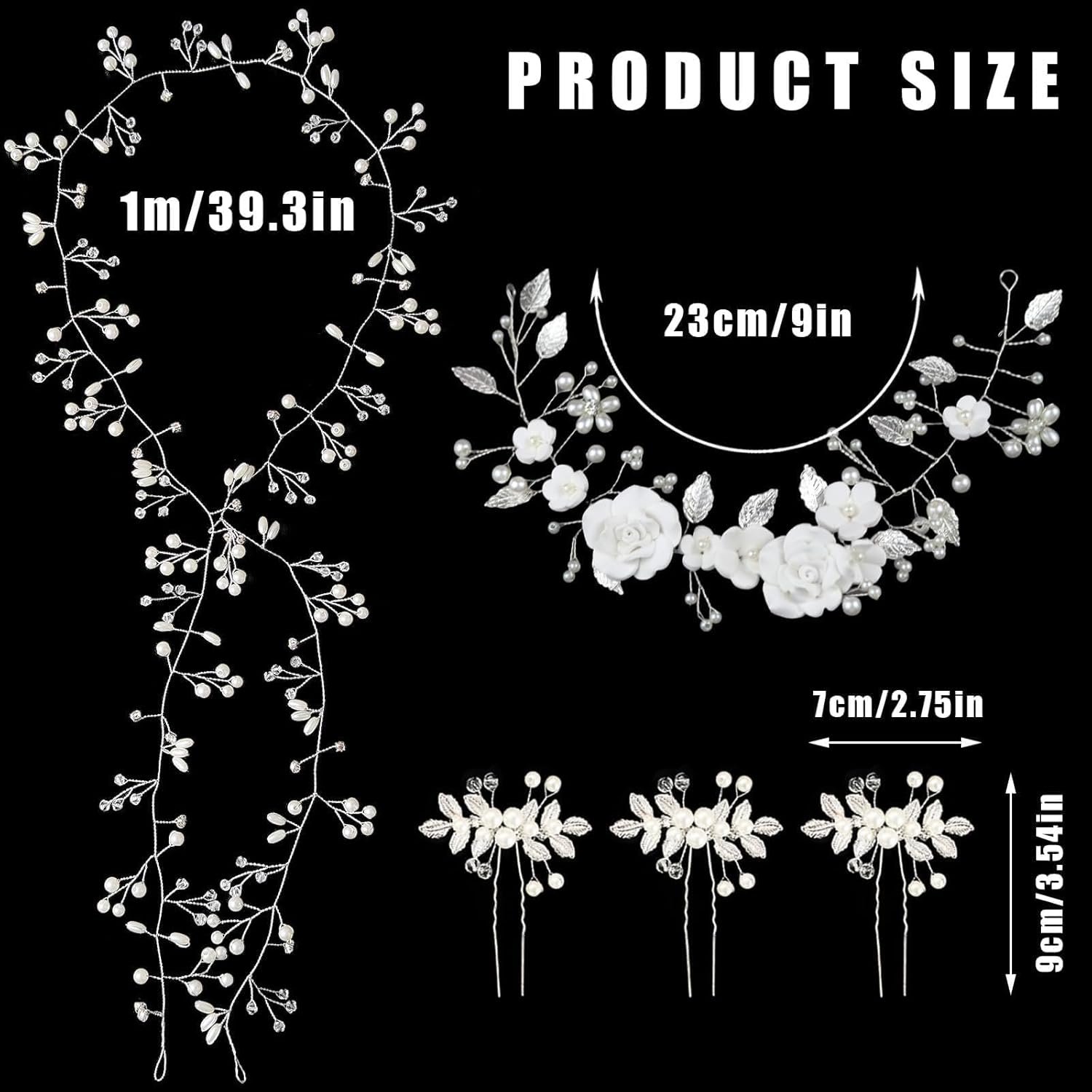 [Bridal Wedding Hair Accessories] Our bridal wedding set consists of 5 hair accessories in 3 styles. 1 ceramic flower headband, 1 silver crystal pearl headband, 3 pearl crystal hairpins. Ceramic flower headband, silver crystal pearl headband, pearl crystal hairpin size as shown in the figure.