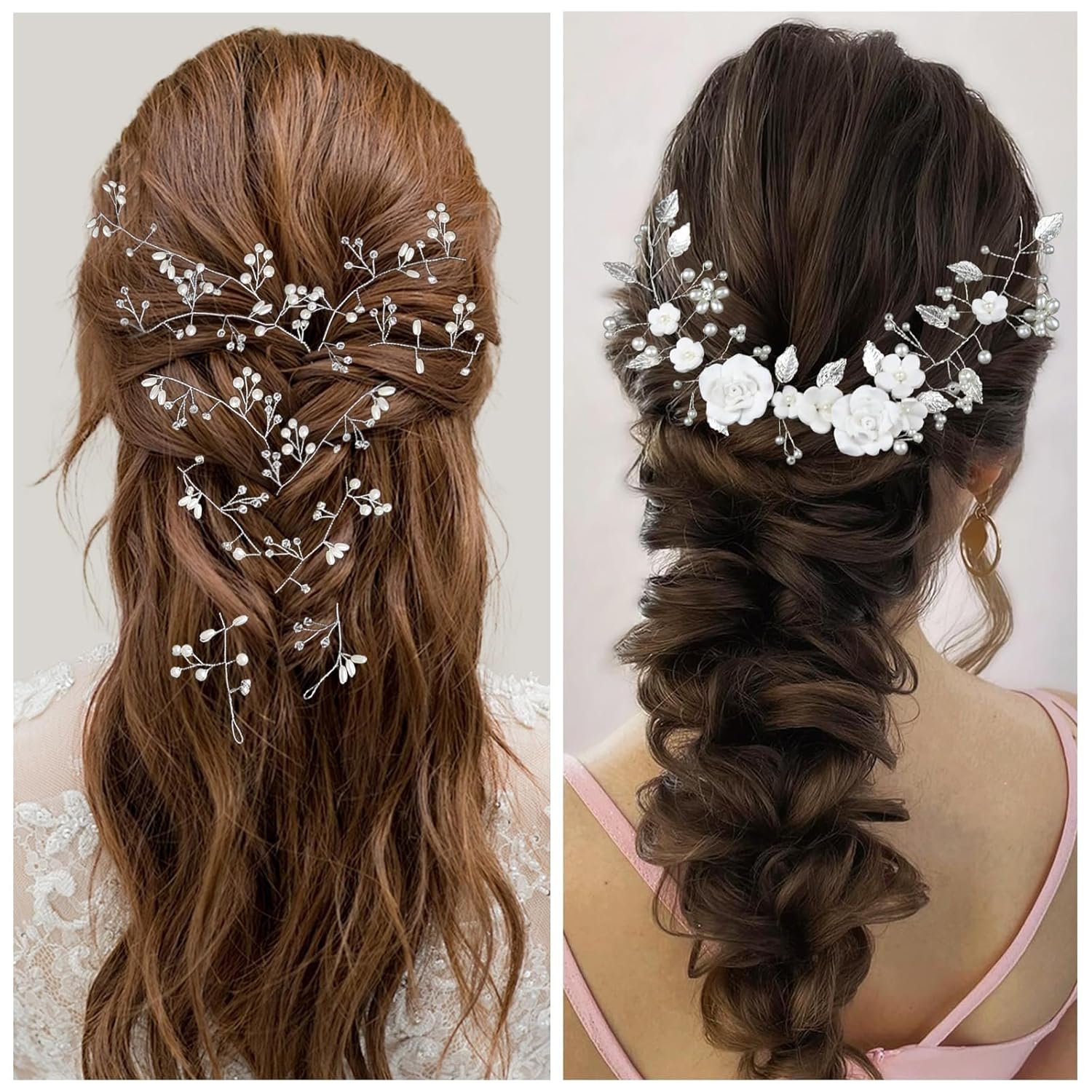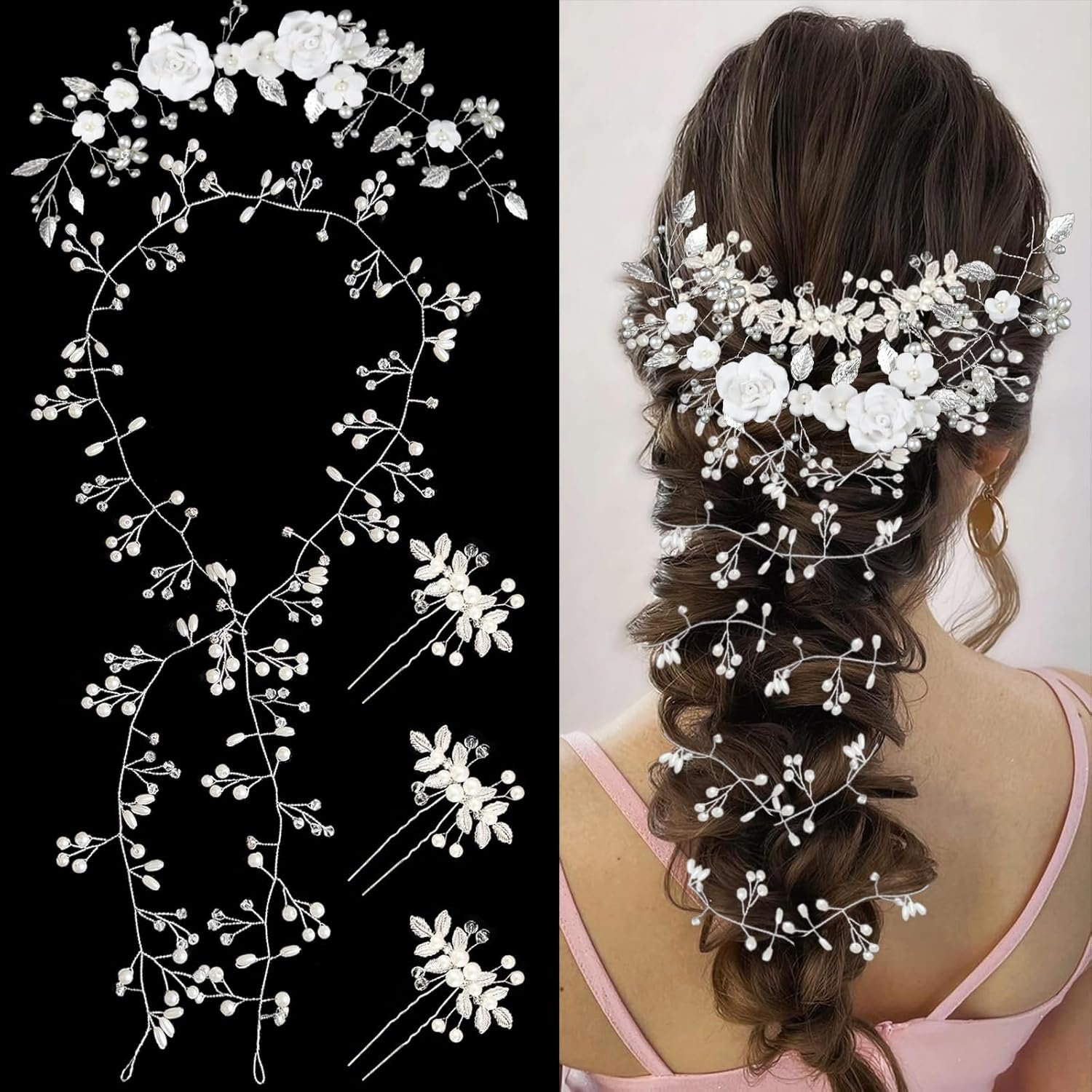 5 Pcs Bridal Hair Accessories Extra Long Silver Crystal Pearl Hair Rattan Ceramic Flower Headband Pearl Crystal Hairpin Women Girls