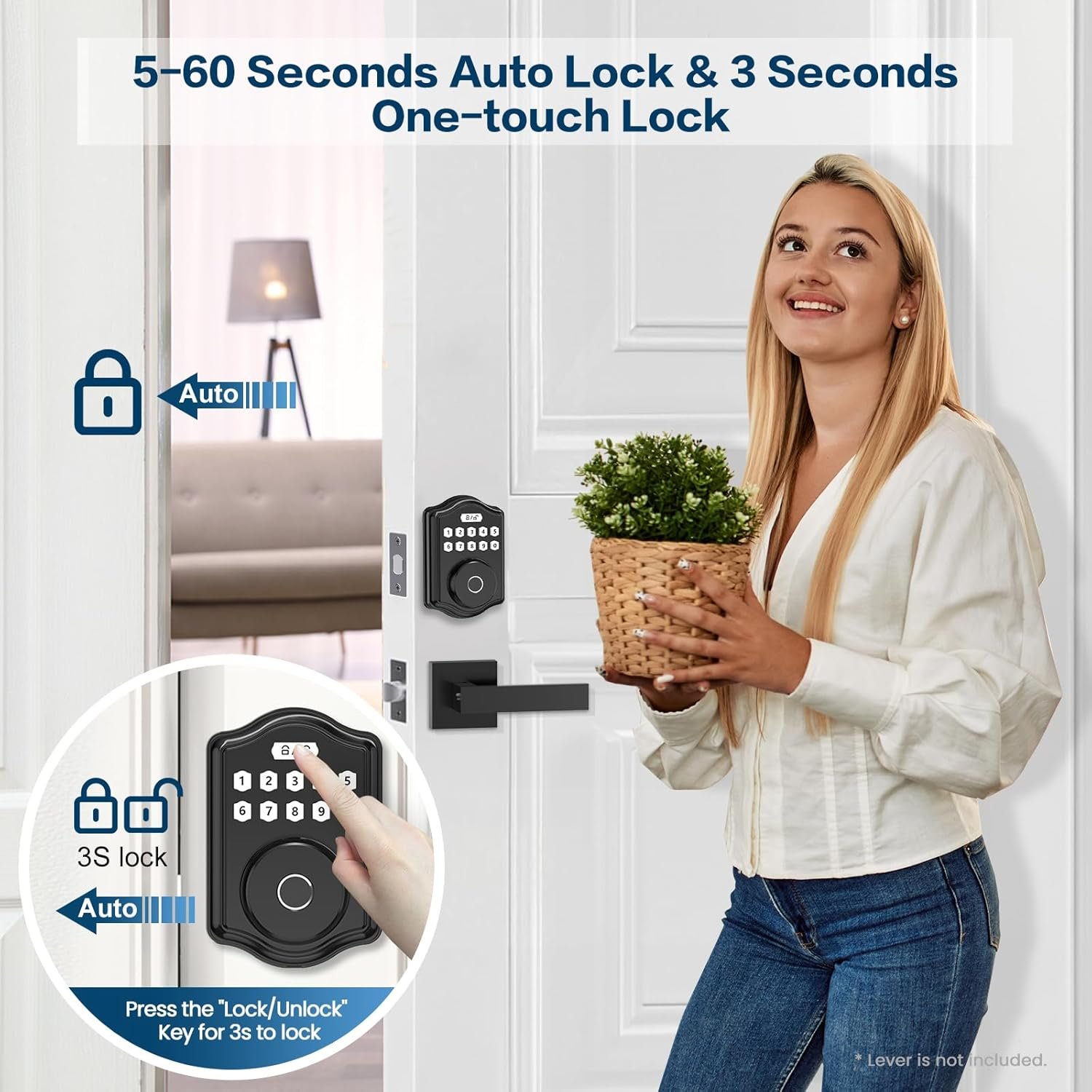 Auto Lock & One-Touch Locking: This keyless entry smart door lock can set to be locked automatically in custom-setting time (5s-60s) after the door closed while you leave home in hurry. and you don’t have to worry about forgetting to lock the deadbolt lock anymore. Or you can press the “lock/unlock” on the panel 3 seconds to lock it immediately.