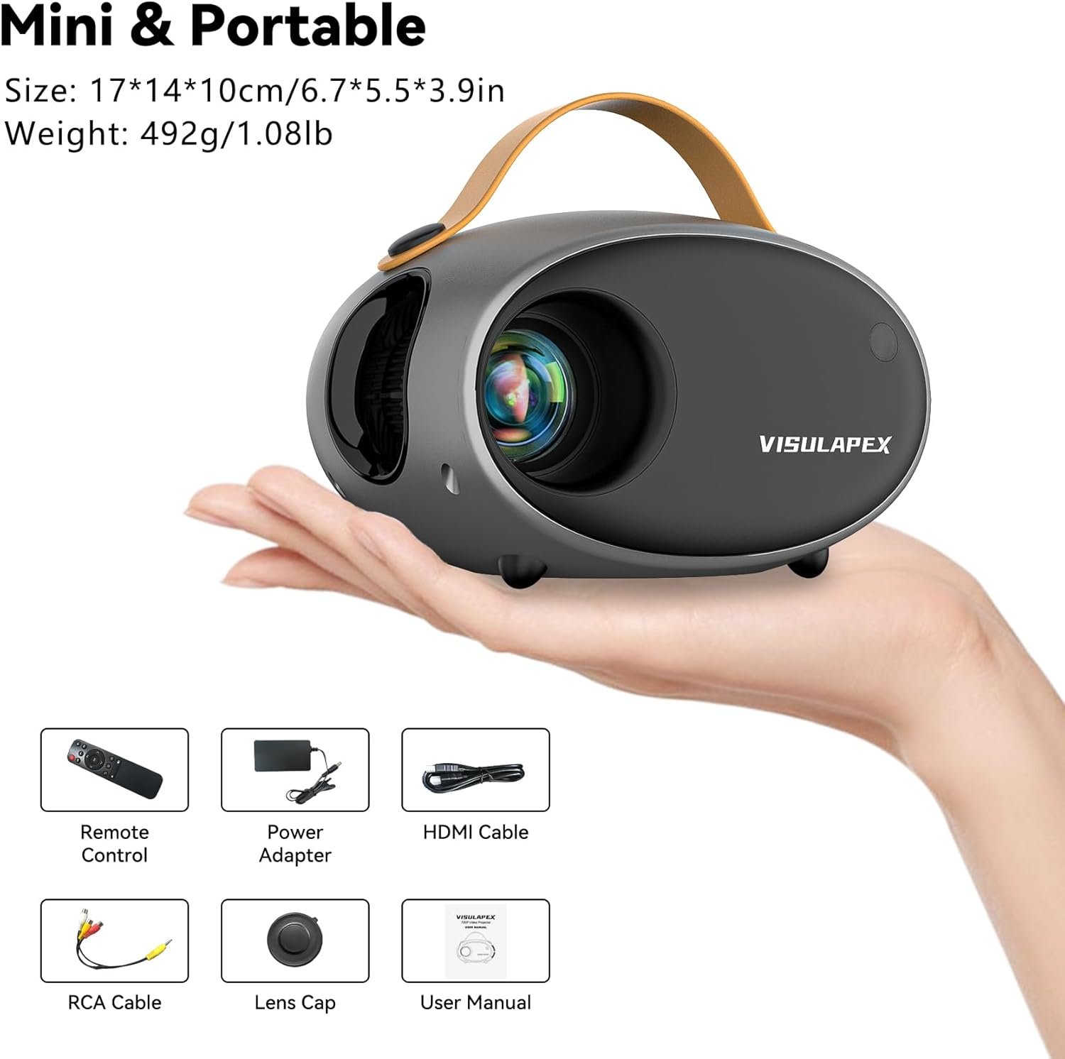 【Mini Design & Large Screen Size Experience】The mini projector adopts the hand belt design, which is stylish and portable, If you move, travel or camp a lot, this is your best movie watching companion! Its small body is powerful enough to provide a viewing size from 20″ to 300″. You can get a clear and high quality image by adjusting the manual focus and keystone correction ±15°. With the remote control, the screen size can be zoomed from 50% to 100% without moving the screen!