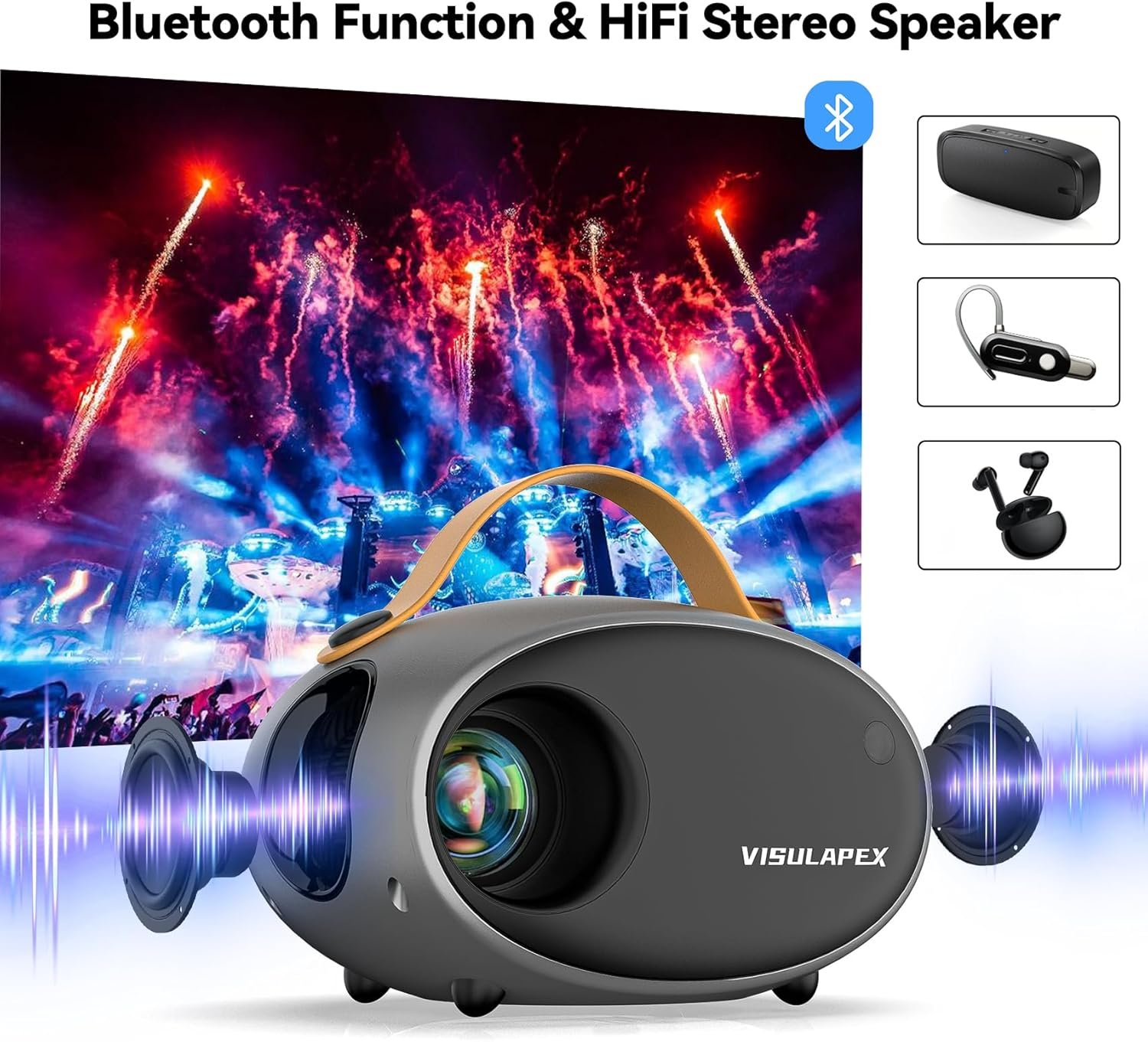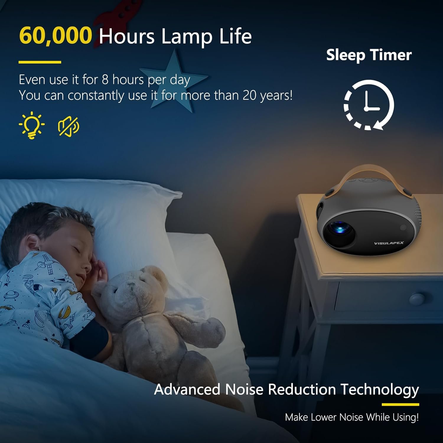 【Latest Upgraded 1080P Projector】This Newest Mini Projector supports 1920*1080 resolution, 10,000 Lumens high brightness, supports 4K smartphone video screen sync, HD lens and 60,000 hours long lamp life, which allow you to enjoy wonderful visual feast more than 20 year. Its LCD color calibration technology and 3000:1 high contrast can restore more intricate color details than other mini projectors, bringing you a real, dynamic and color vibrant 1080P HD projection image quality.