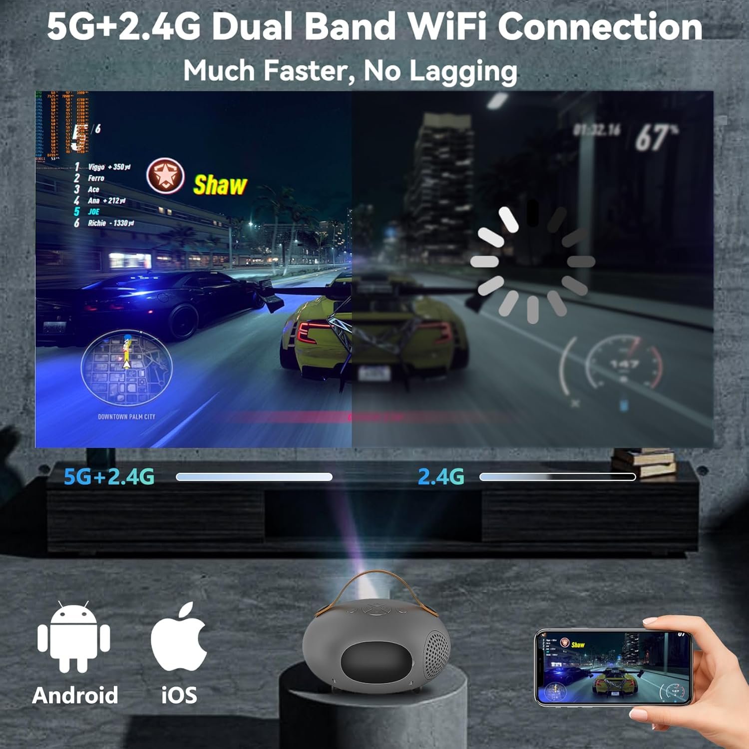 【Faster & Stable 5G Dual WiFi Connection】This projector is equipped with the latest 5G WiFi technology, which can effectively avoid signal interference, ensure stable signal and fast transmission speed. So you can watch videos or play games smoother and more stable!