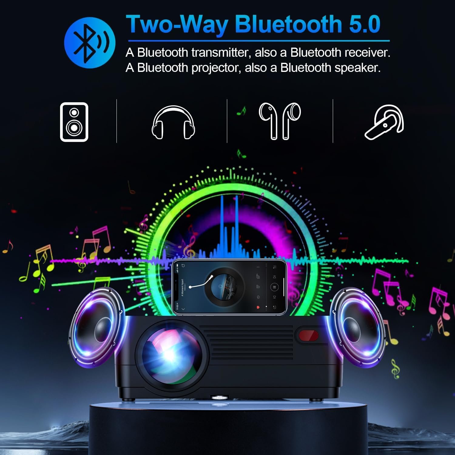 CEBORY Bluetooth projector is equipped with the latest Bluetooth chip, adopted the creative bidirectional Bluetooth technology, which makes the transmission more stable. Not only can it be easily connected to Bluetooth speakers, Bluetooth headsets, Bluetooth soundbars, or other audio devices, it can also be used as a speaker to connect to smartphones/tablets freely. Equipped with Hi-Fi stereo surround speakers, the sound is more pure and clear, whether it is used indoors or outdoors, powerful speakers can bring you an immersive high-quality sound experience.