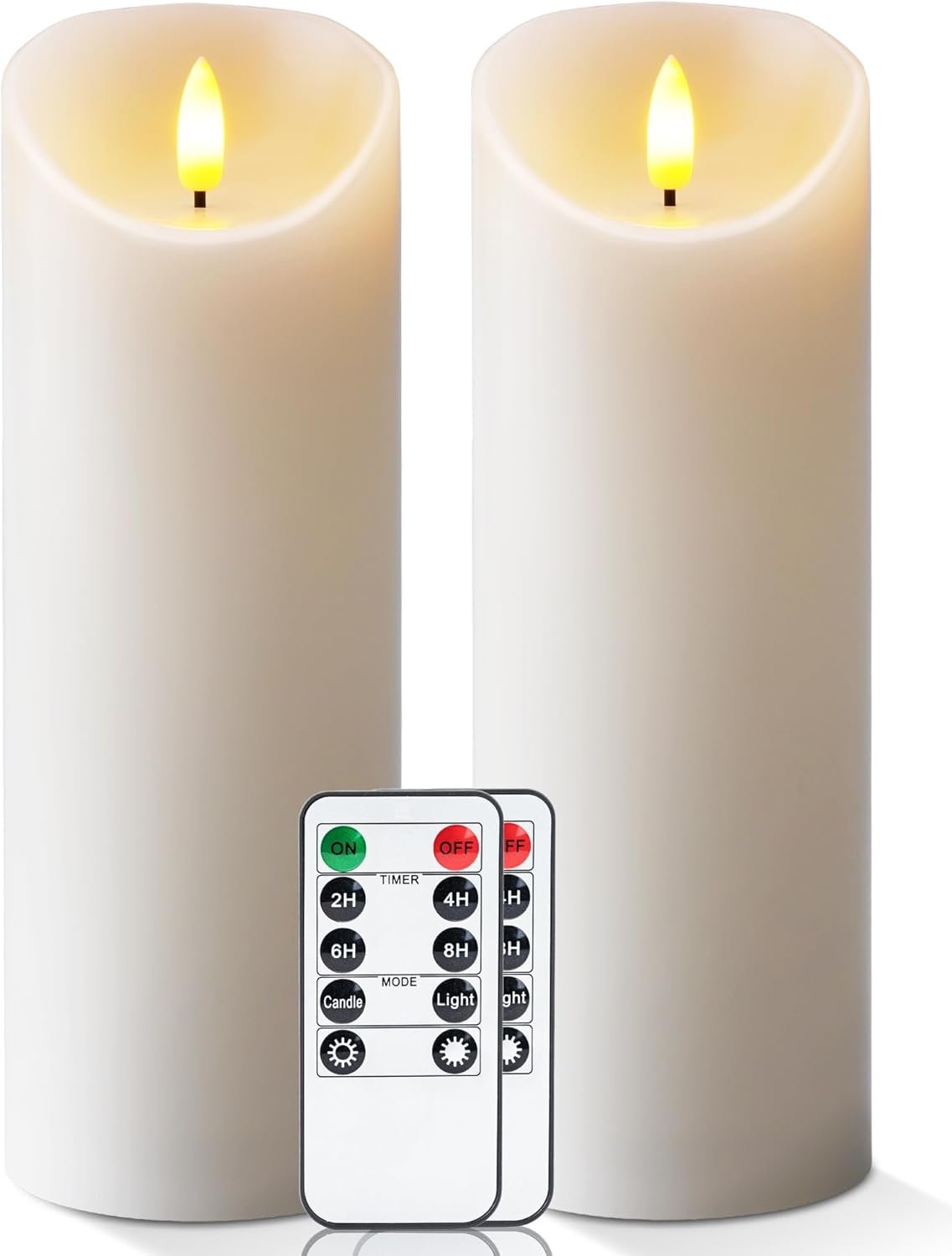 Package Includes: 2 wax flickering candles (Ivory, H9” x D3”), 2 x 10-key remote, 1 x user manual. Each LED candle requires 2 x AA batteries (not included).