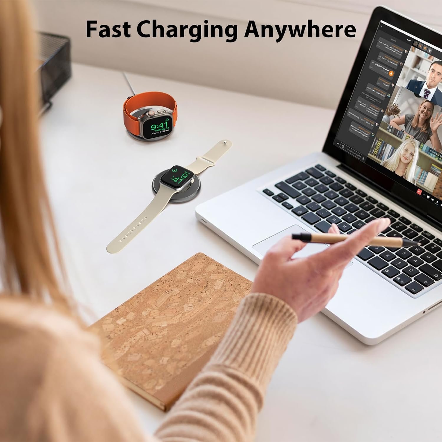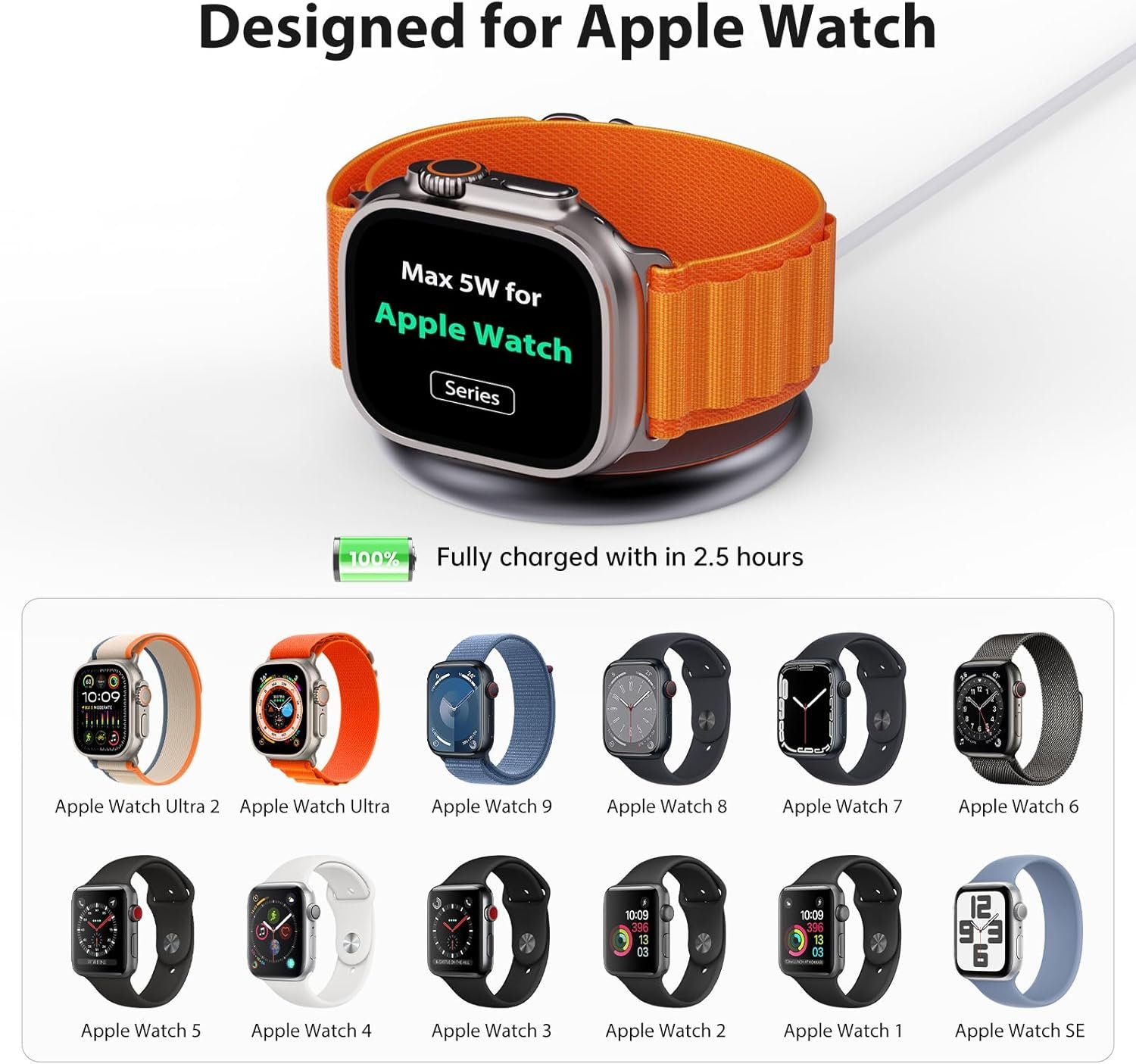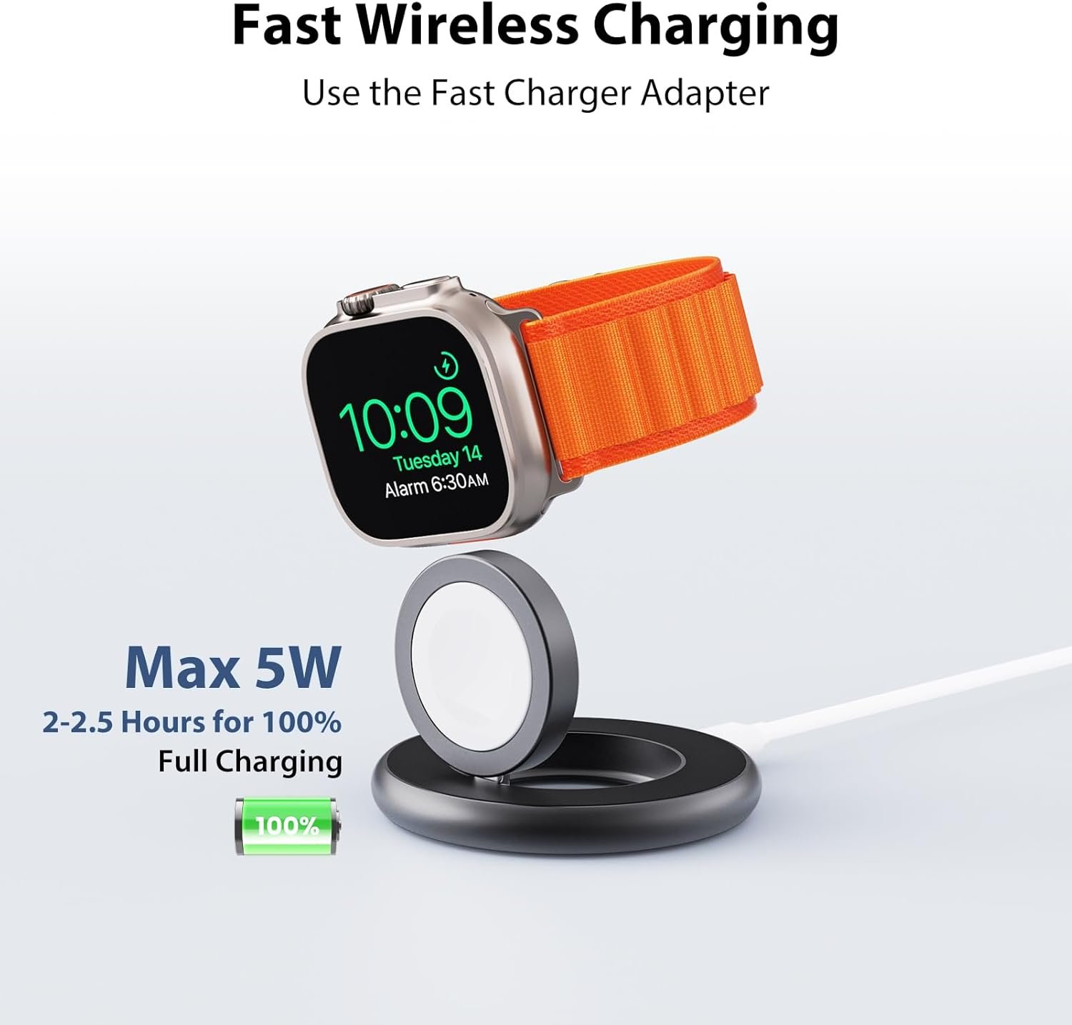 【5W Fast Wireless Charging】This Apple watch charger is equipped with a high-performance chip that supports iwatch charging with up to 5W fast charging. It can quickly and safely charge the iwatch Ultra 1/Ultra 2 series from 0% to 100% battery in just 2.5 hours, compared to other apple watch chargers with a charging time up to 4 hours.