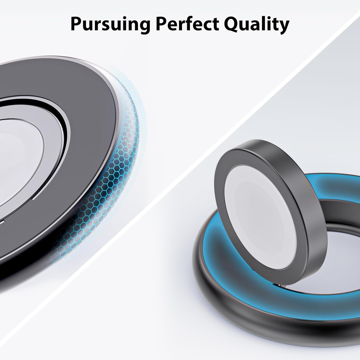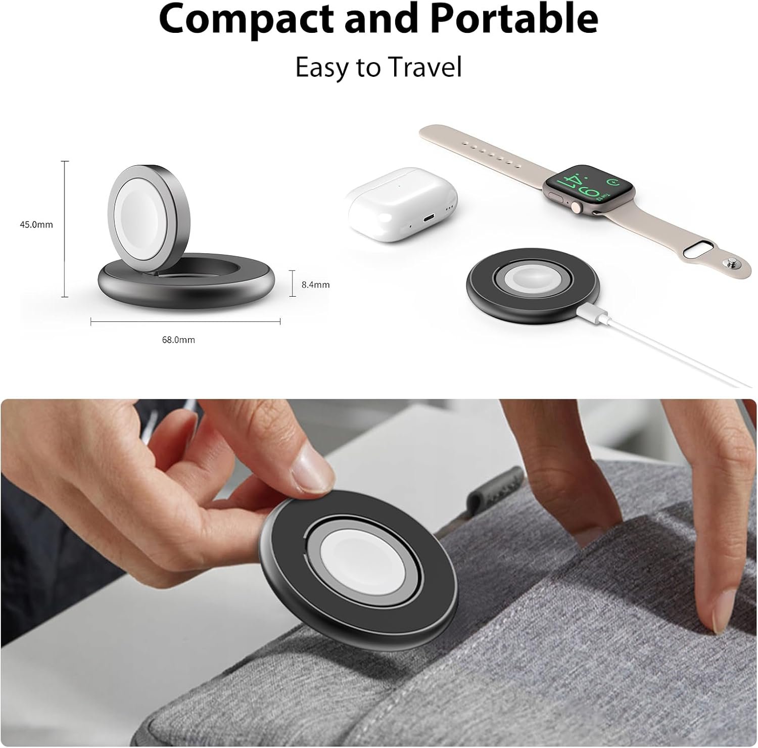 【All Aluminum Alloy Material】CNC machined aluminum alloy body ensures excellent durability and superior heat dissipation, while the exquisite and stylish round design brings comfortable touch feeling. The bottom of the apple watch charger is designed with non-slip pads for ultimate texture. No more worries about your iwatch slipping off any surface during charging.