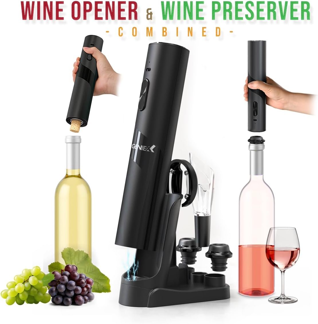 🍷【ALL-IN-ONE ELECTRIC WINE SET】GenieX Electric Wine Opener Set 6-in-1 include most necessary and useful wine accessories you need, magic wine foil cutter for fast foil cutting, wine aerator and pourer for wine aerating & wine pouring and 2 silicone wine stoppers for wine preservation, charging stand for wine accessories well organized. Apartment must haves GenieX 6-1 Electric Wine Opener with Charging Base.