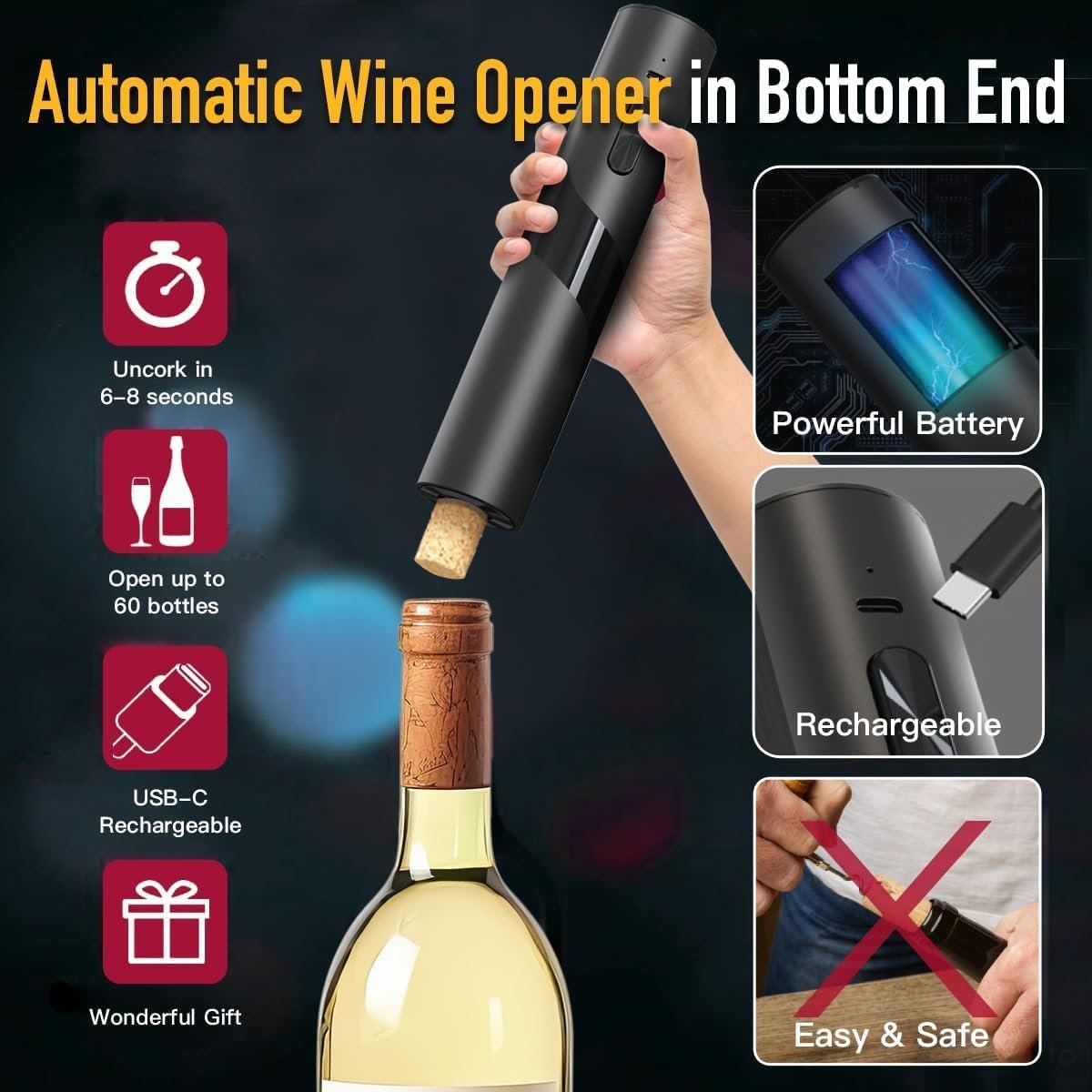 🍷【RECHARGEABLE & POWERFUL】GenieX Automatic Wine Opener opens to 60 wine bottles with a full charge. The Electric Corkscrew wine opener is recharged when it is put back to the charging stand with USB cable connect to power source. Easy and convenient. At family dinner or Christmas party, the Automatic Wine Opener Electric Corkscrew make wine opening and wine serving so enjoyable.