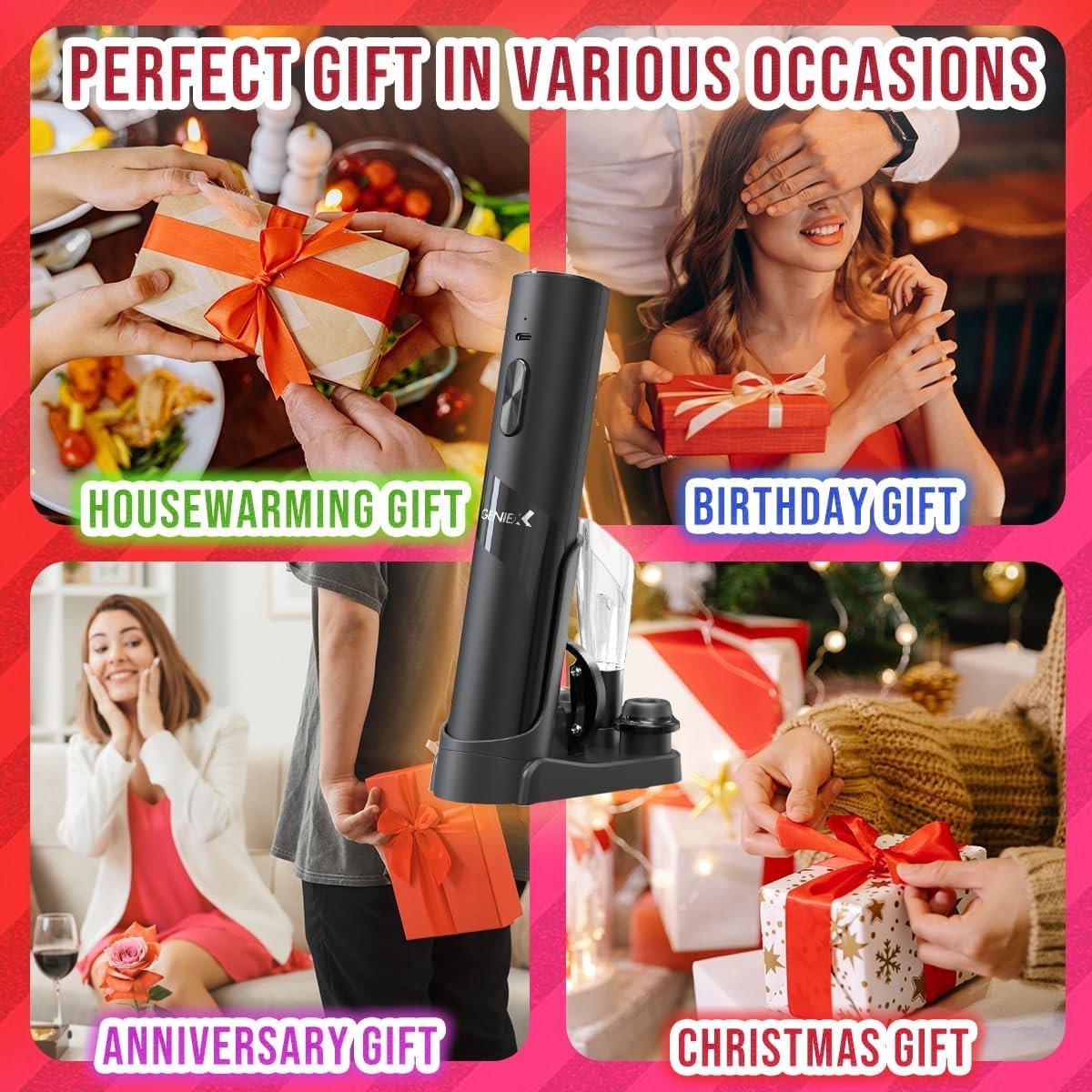 🍷【PERFECT HOUSEWARMING GIFTS】Suprise family or friend by presenting GenieX 6-in-1 Electric Wine Opener with Charging Base as welcome home gifts or Christmas gift. Besides, it is a perfect ThanksGiving Gift Housewarming Gift, valentines day gifts, birthdays gifts for women & men, anniversary gift for husband or wife, present for boyfriend or girlfriend, wedding registry gifts, party gifts and wine gifts for wine lovers… All-in-one wine kits, fast wine opening and safe operation, rechargeable in charging base with all wine tools well organized.