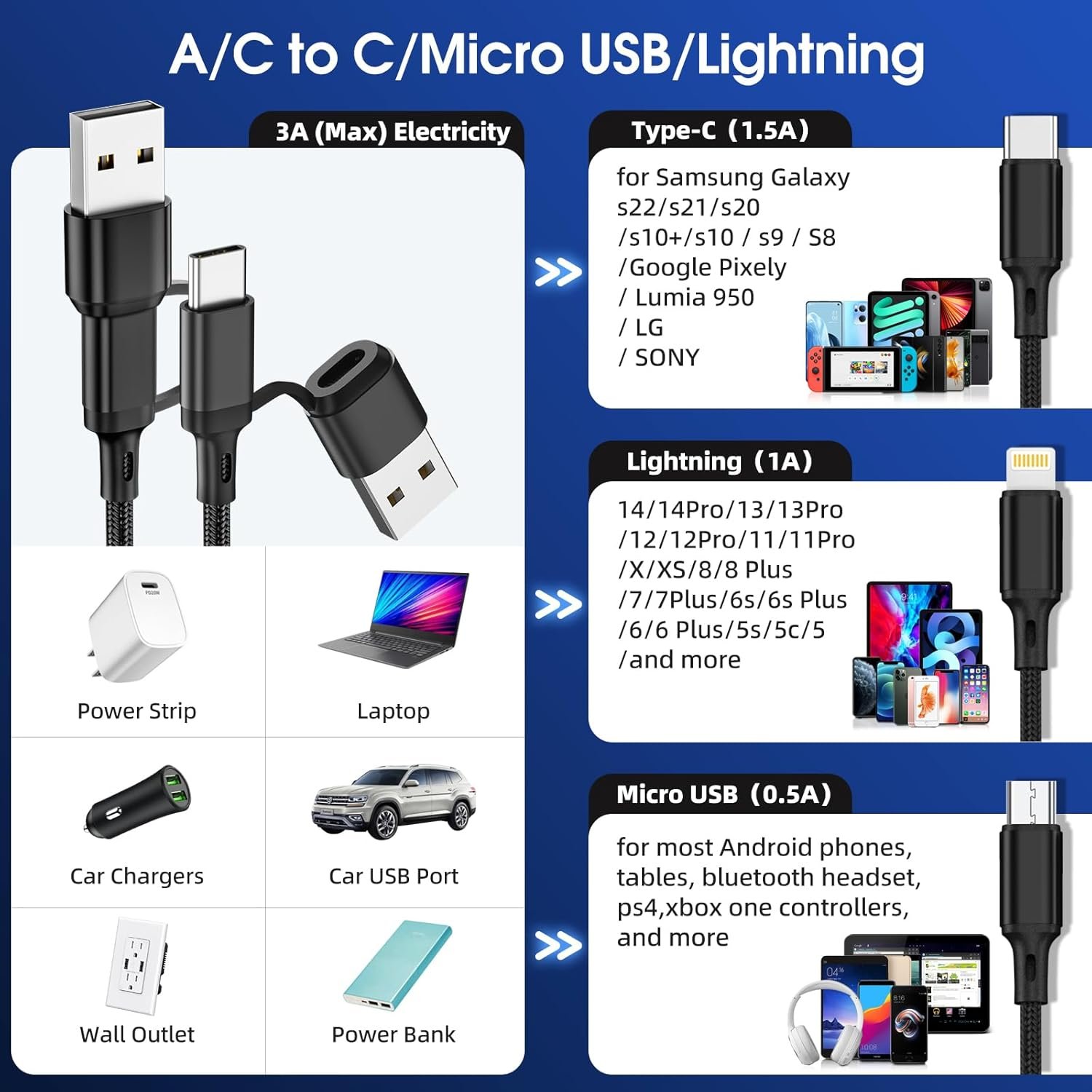 【Universal Multiple Charger Cable】Multi USB cable works with All USB Type-C/micro USB/ iProduct devices. 3A nylon braided high speed multi charging cord, compatible with Phone 14 13 12 11 Pro Max / 14 13 12 11 Pro / 13 12 Mini / 14 Plus / 14 / 13 / 12 / 11 / SE / Xs Max / Xs / Xr / X / 8 Plus / 8 , Pad Air / Pro, / Samsung Galaxy S22+ / S22 / S21+ / S21 / S20+ / S20 / 210+ / S10 / S9+,HTC, LG, Sony, Google Pixel , Moto, PS 4/5 and other Android devices for most mobile phone charging.