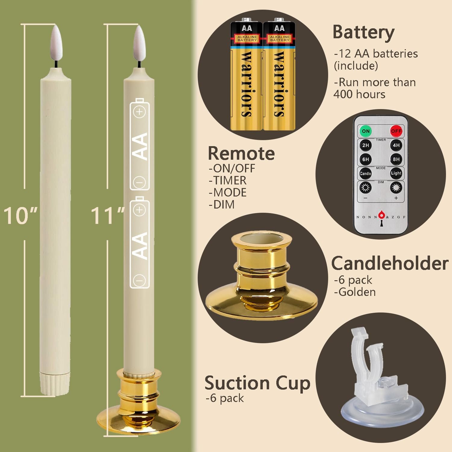 Package included: 6 windows candles + 12 AA Batteries + 6 golden Removable candle holders + 6 suction cups +1 remote. The included battery is high capacity and can run more than 400 hours continuously