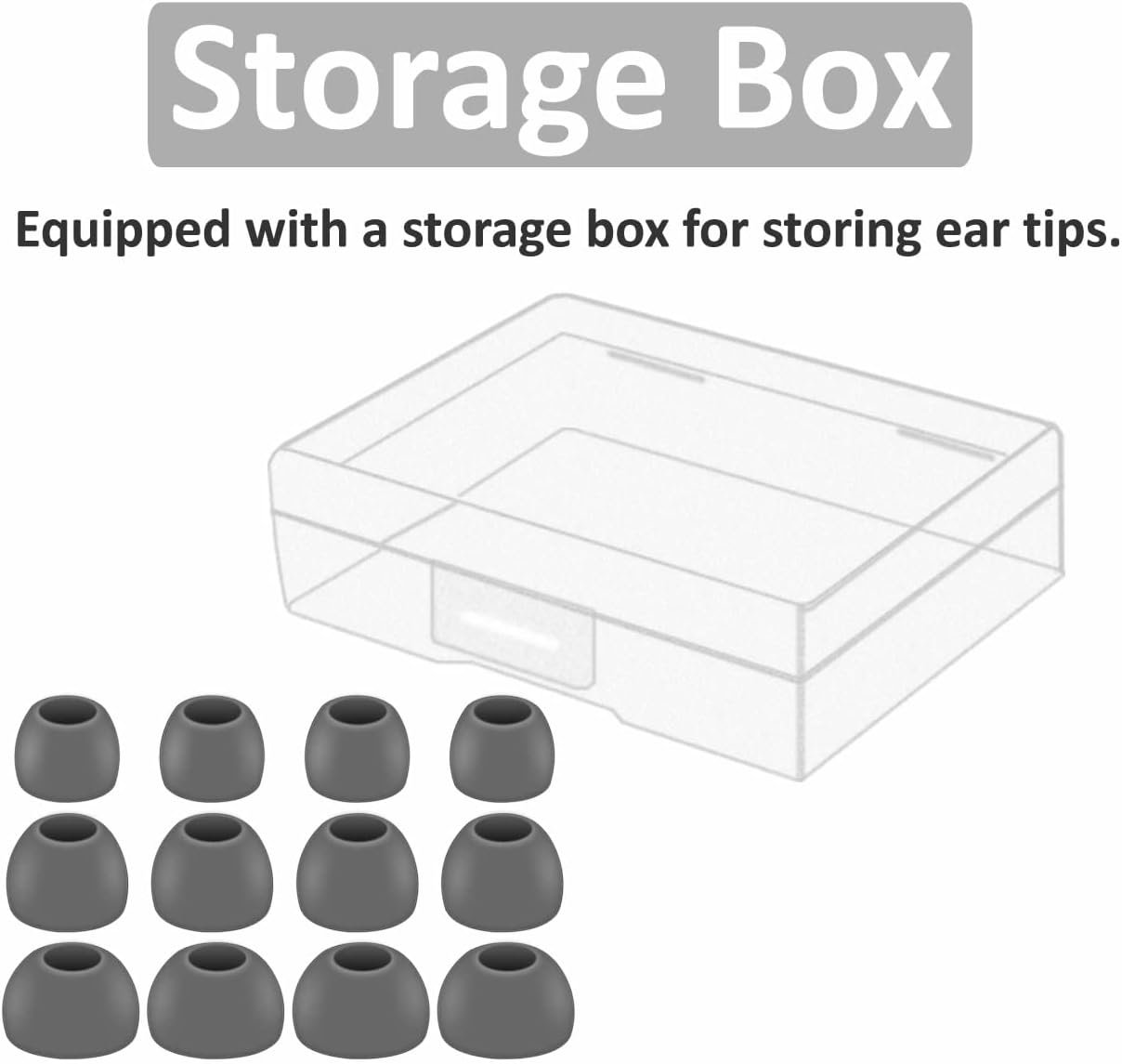 【 Storage Box 】 Equipped with a storage box for storing 6 pairs ear tips ( S/M/L 3 size, 2 pairs per size ), ear tips only, earphone and charging case NOT included.