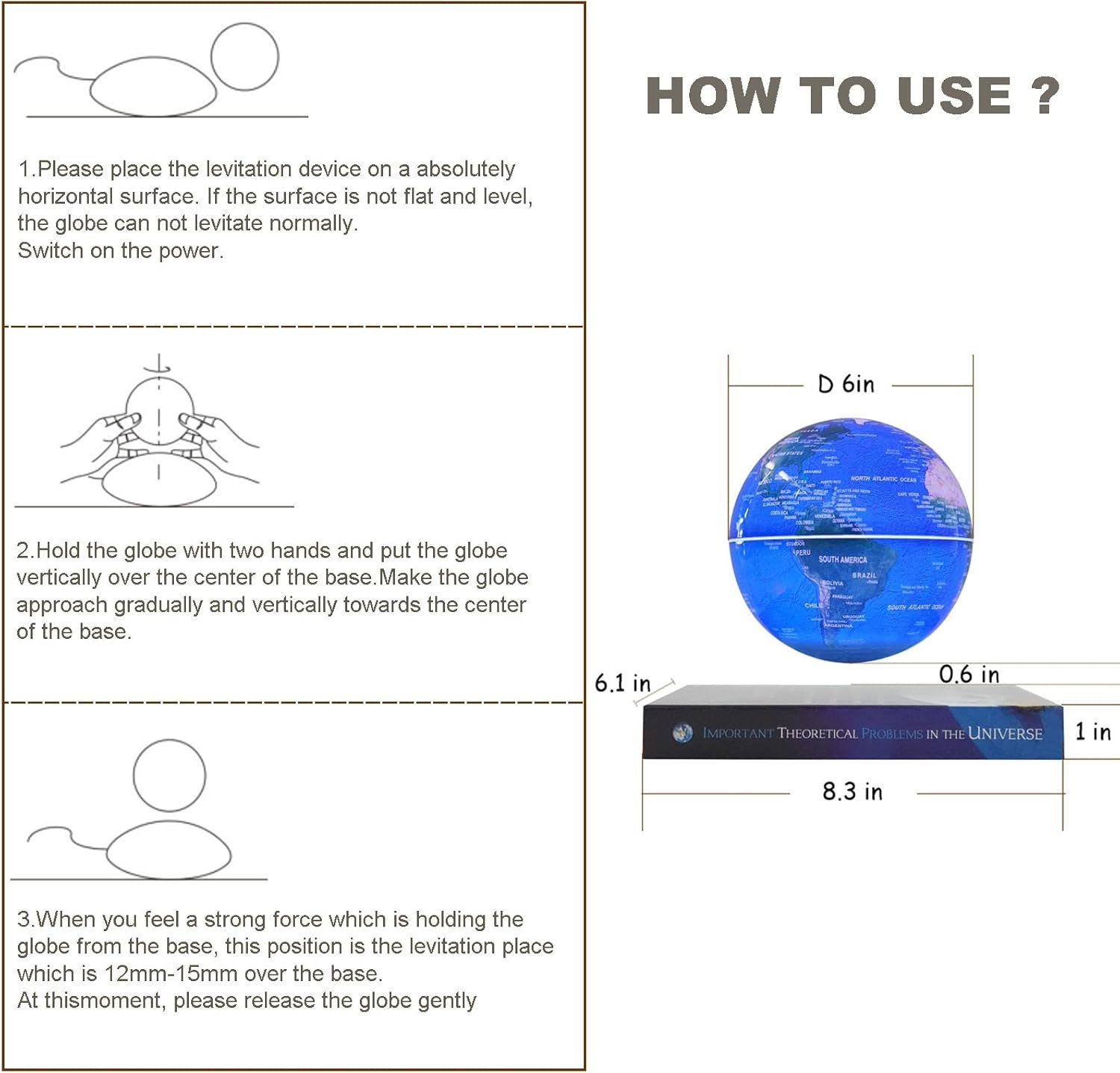【KEEP WORKING】The globe is made to operate 24×7 no need to shut it off! As long as the base is powered the globe levitates perpetually. The globe is attracted to the polarity in the base and once the base is powered off will cling to the base naturally