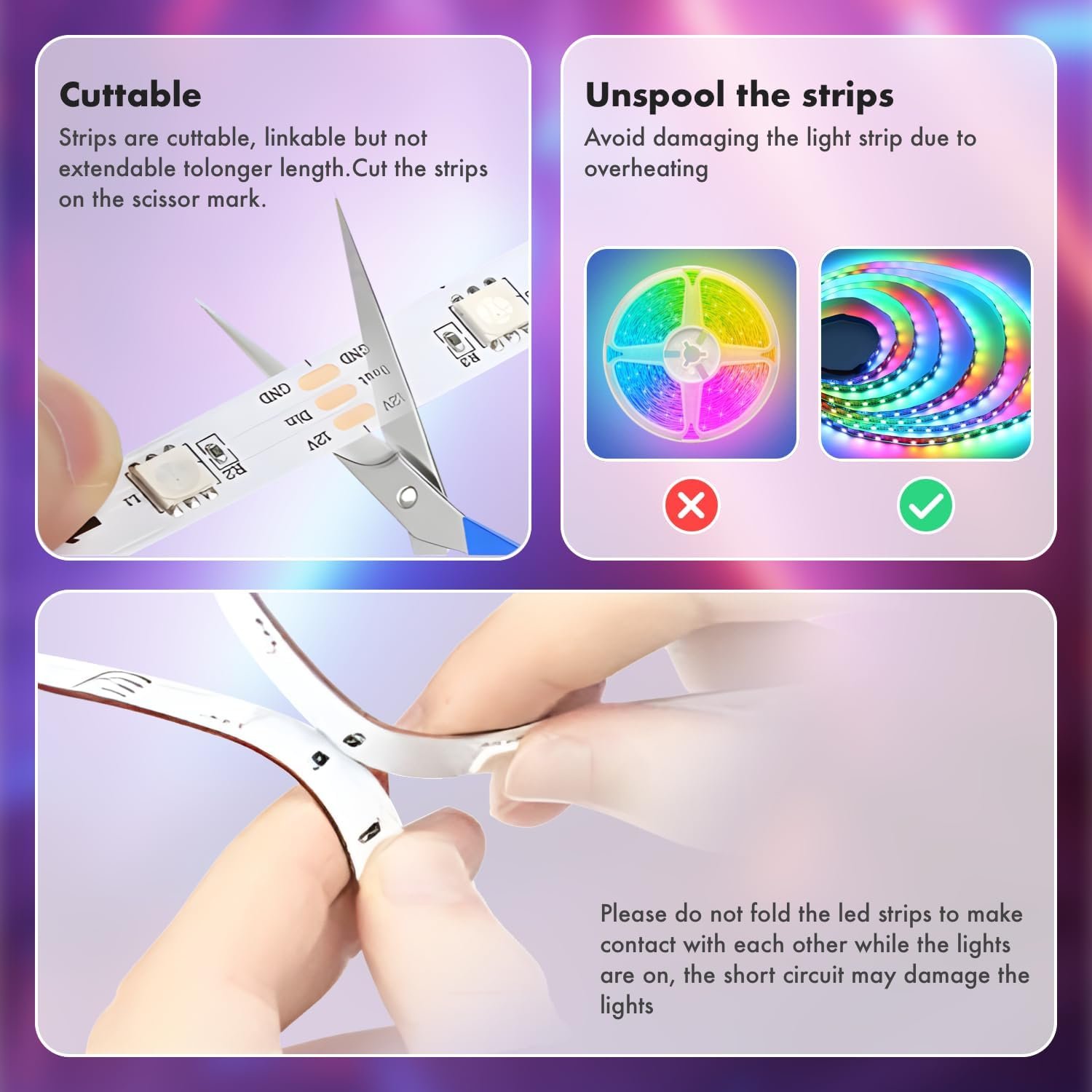 Note: Please wipe the surface well to make it clean and dry before intalling the smart LED strip lighting for home decorations. Hair, dust and other stuff may affect the stickiness of the tape. (Not recommended for outdoor use.)