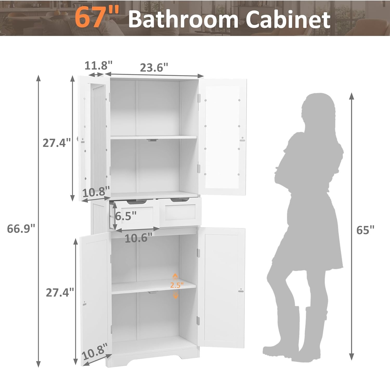 Minimalist Style: The storage cabinet minimalist design will work seamlessly with the rest of your home furniture for a polished look. Clean straight lines in white make the cabinet more elegant and beautiful, which can easily blend in various decoration styles. Glass matches with a silver knob, this linen cabinet adds a modern appeal and creates a cozy vibe