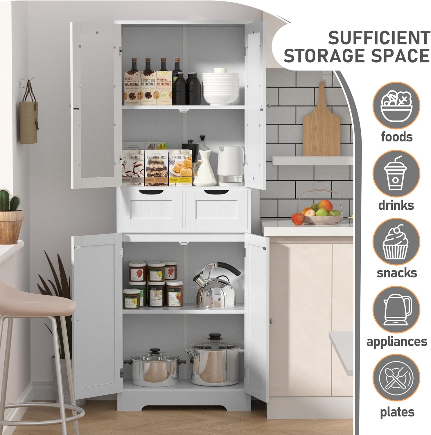 If you’re looking for a piece of cabinet with ample storage without sacrificing style or comfort, Betterhoood Stylish White tall kitchen pantry storage cabinet for your Home,featuring a clean-lined contemporary design, can fit into various styles of decorations.