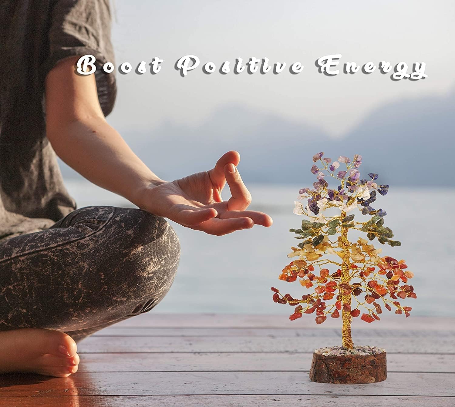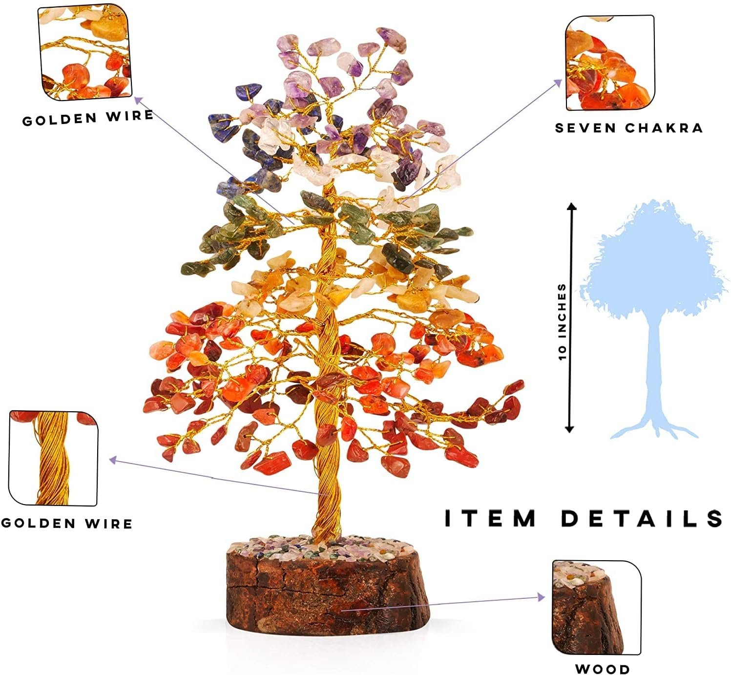 🌳【SEVEN CHAKRA TREE OF LIFE】This handcrafted bonsai tree with seven natural crystals and healing stones is approx 10 inches in length. The feng shui tree has its origin in Gujrat India, the good luck money tree is complemented by a wooden base so that it could be placed on any surface securely. The branches & trunk are built from flexible golden wires. This elegant tree of life with its sober beauty will not only create a space for serenity but will also enhance the home office desk decor.