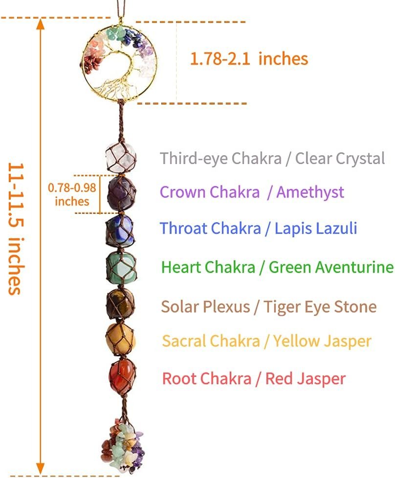 [7 Chakras Healing Crystals]: Clear Crystal Quartz, Amethyst, Lapis Lazuli, Green aventurine, Tiger eye, Yellow Jasper, Red Agate. Tree of Life Size: 1.77 inches,Tumbled stones size: 0.7-0.98 inches, Chipped stones size: 5-8mm. Total Length: 11-11.5 inches