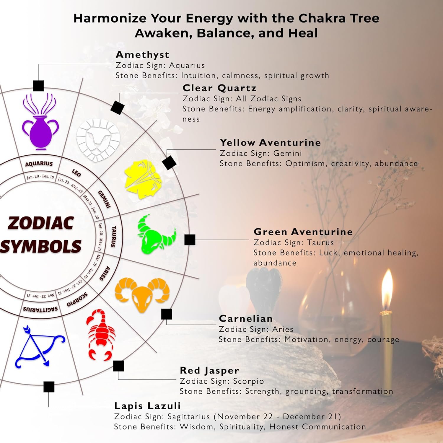 Seven chakra stones: womens birthday gifts unique 7 chakra tree includes Red Jasper- Root Chakra (Muladhara), Carnelian- Sacral Chakra (Swadhisthana), Yellow Aventurine- Solar Plexus Chakra (Manipura), Green Aventurine- Heart Chakra (Anahata), Lapis Lazuli- Throat Chakra (Vishuddha), Amethyst- Third-Eye Chakra (Ajna), Clear Quartz- Crown Chakra (Sahasrara). 7 chakra tree is gifts for women in their 40s, college graduation gifts for women.