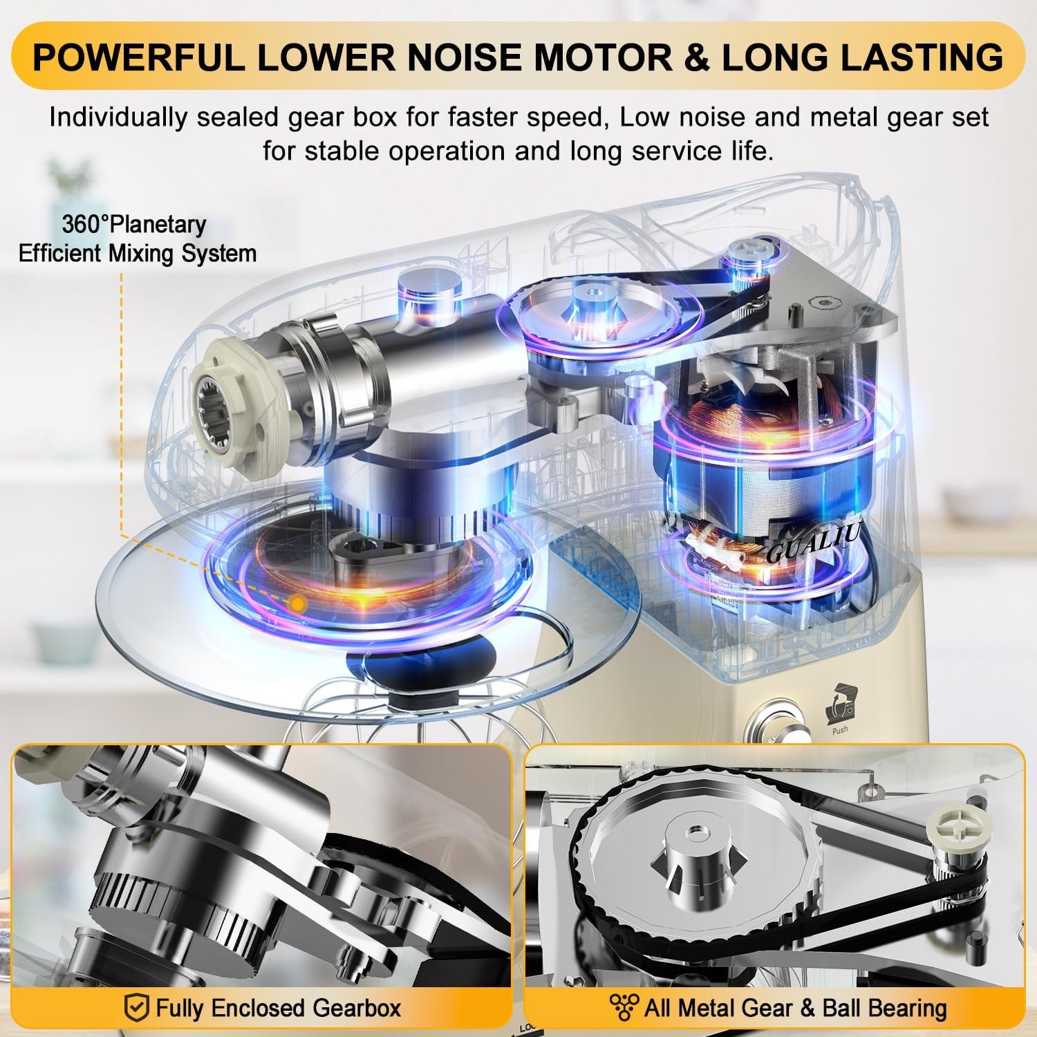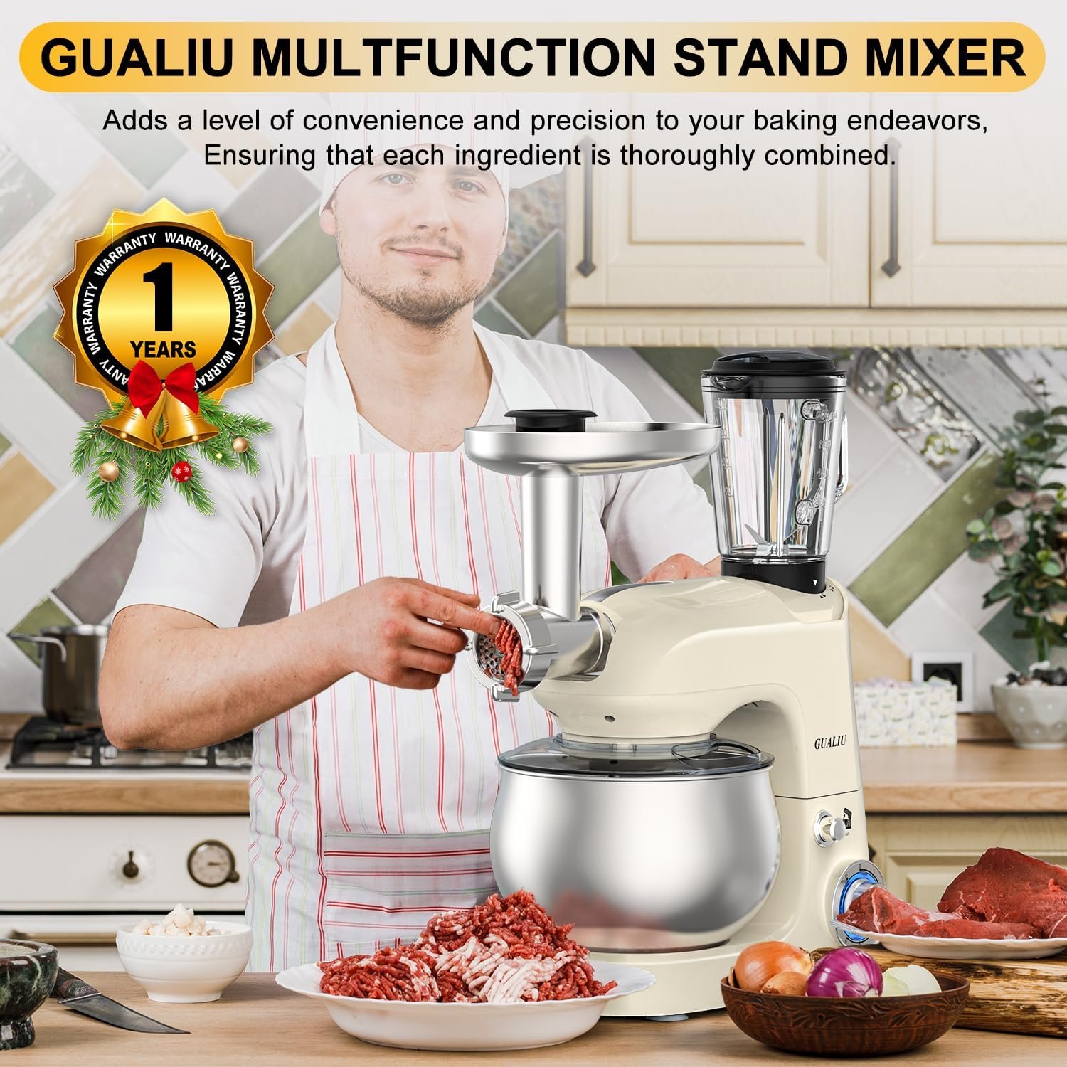 π§ππππ πππ° ππ©π π«πππ ππ«π¨πππ¬π¬π’π¨π§ππ₯ ππ’πππ‘ππ§ ππππ§π ππ’π±ππ«: GUALIU 7 in 1 Kitchen Stand Mixer with high performance motor, with a variety of convenient and practical functions, including kitchenaid dough hook, mixer, whisk, meat grinder, noodle machine, sausage machine, juice beater. It also comes with a 5.3Qt stainless steel bowl mixer, scrape rand splash cover to help add ingredients without creating a mess, Easy to enjoy the fun of baking.