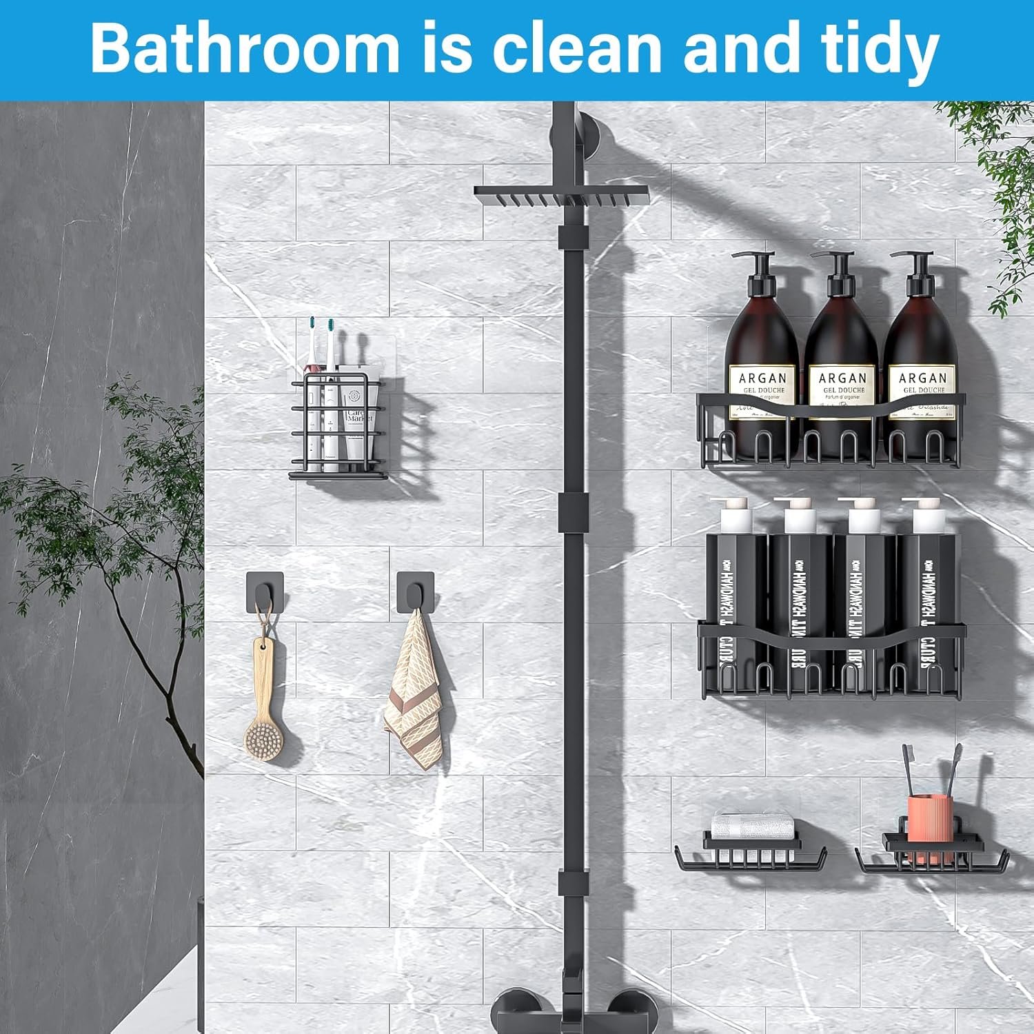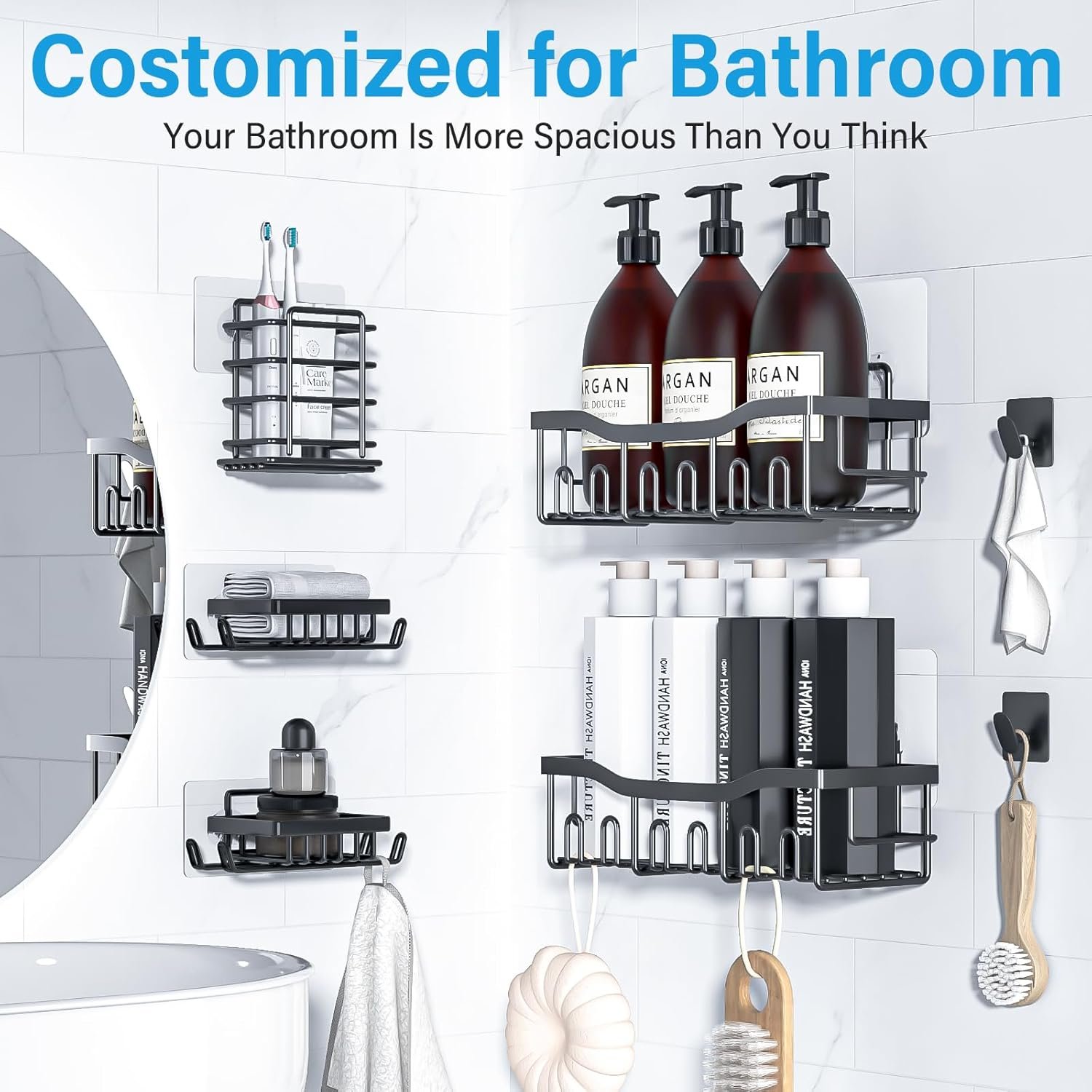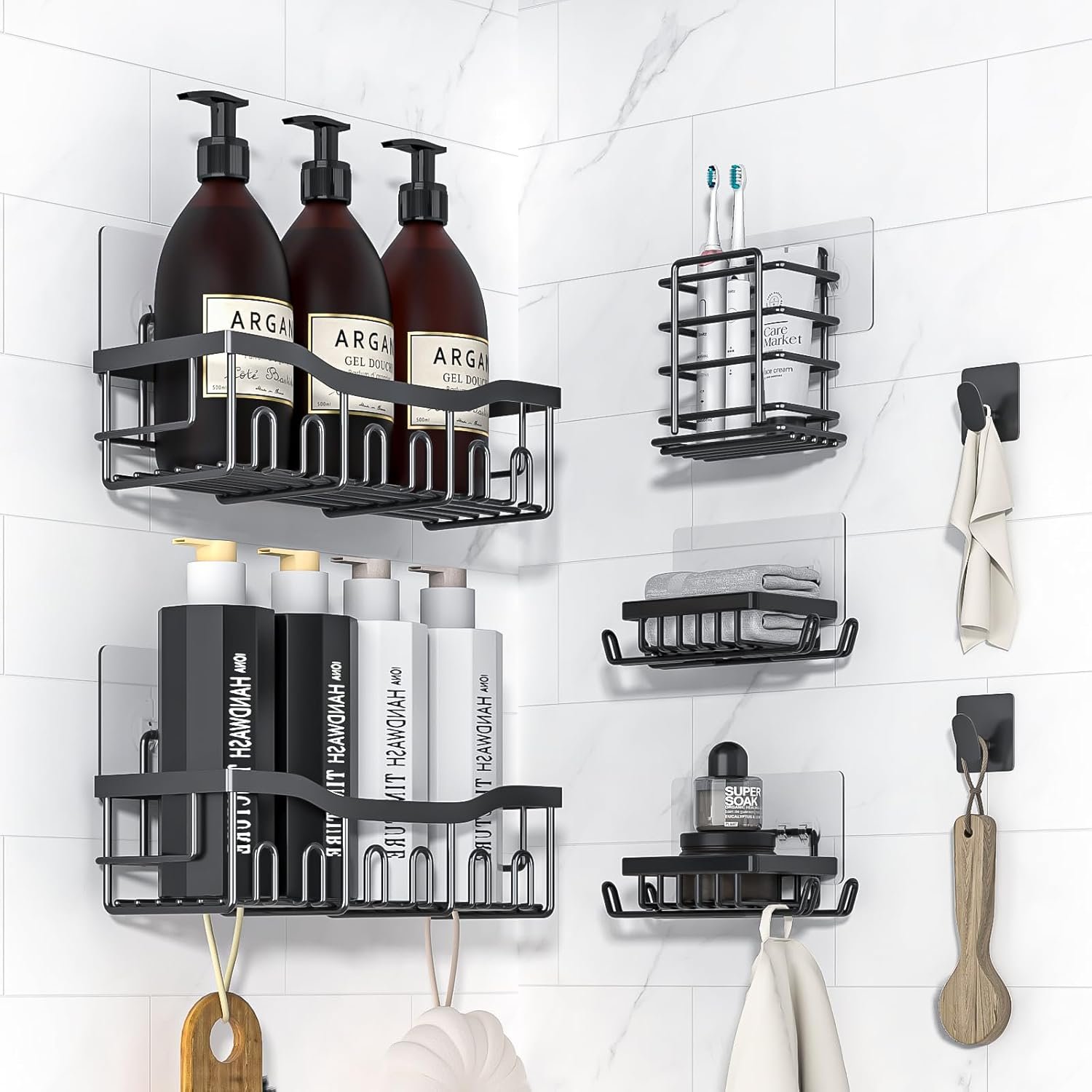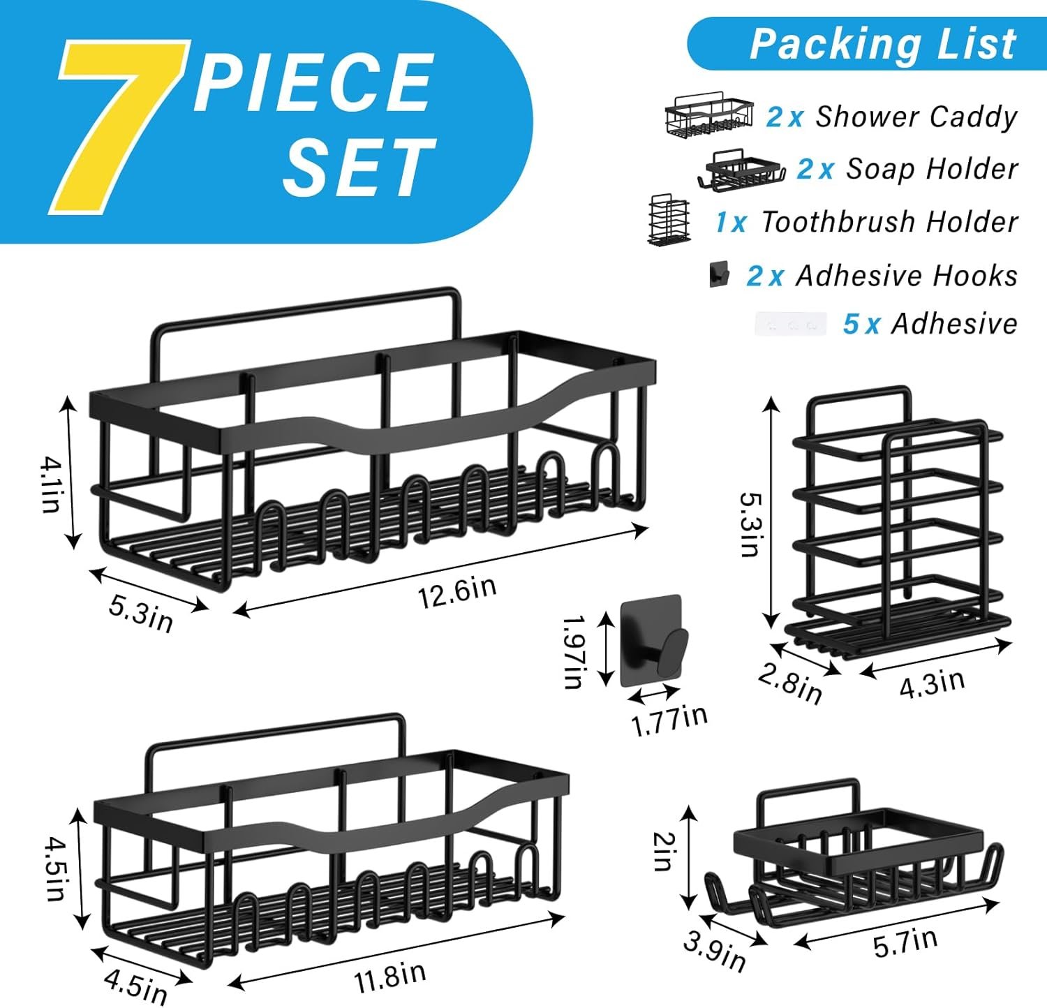 1【Quality Shower Organizer Set】:Adhesive Shower Organizer comes with 7 pieces for different uses, including 2 shower caddies, 2 soap holders,Two towel hooks 1 toothbrush holder and 5 adhesives,The large storage capacity allows you to store more items, Convenient for your life, ideal for home