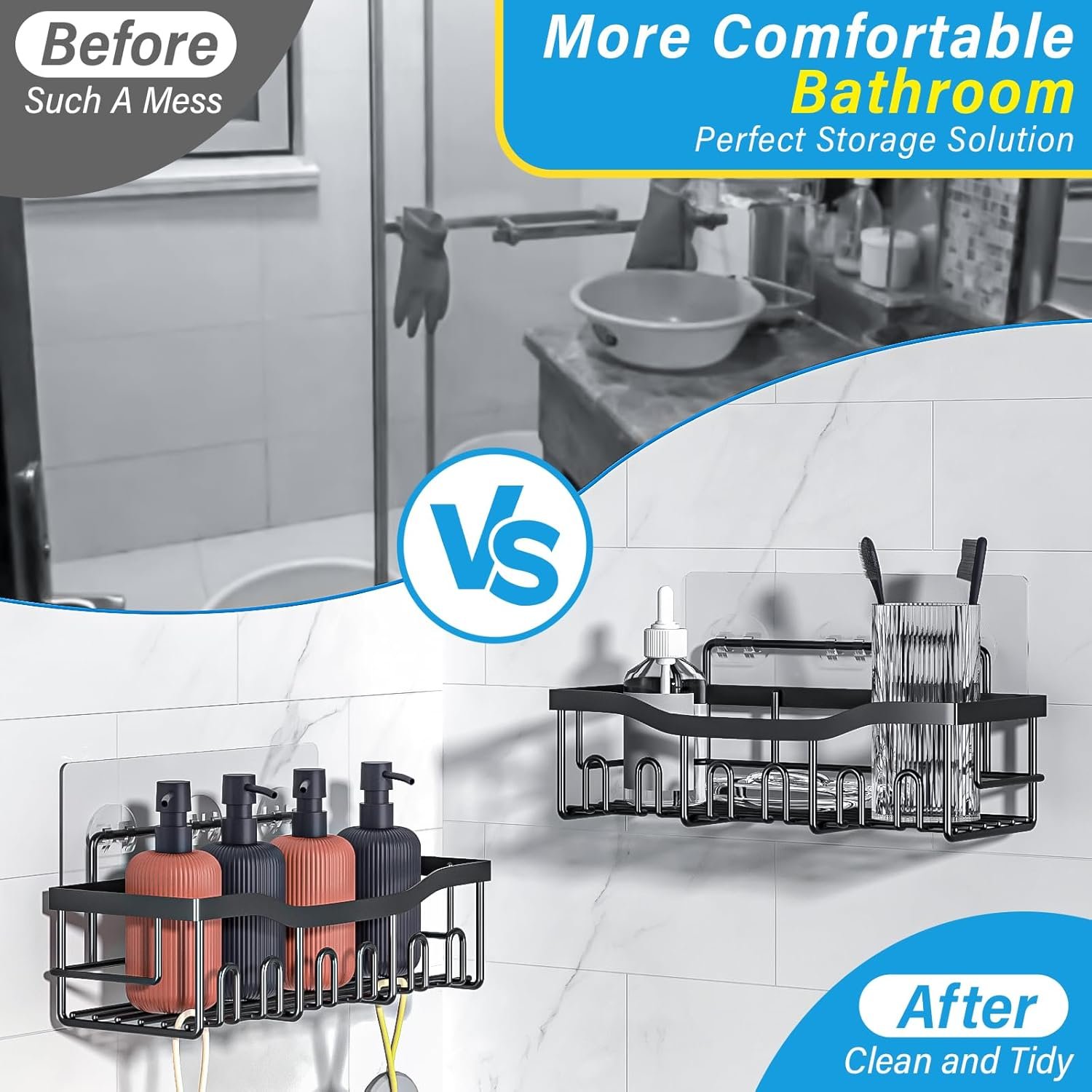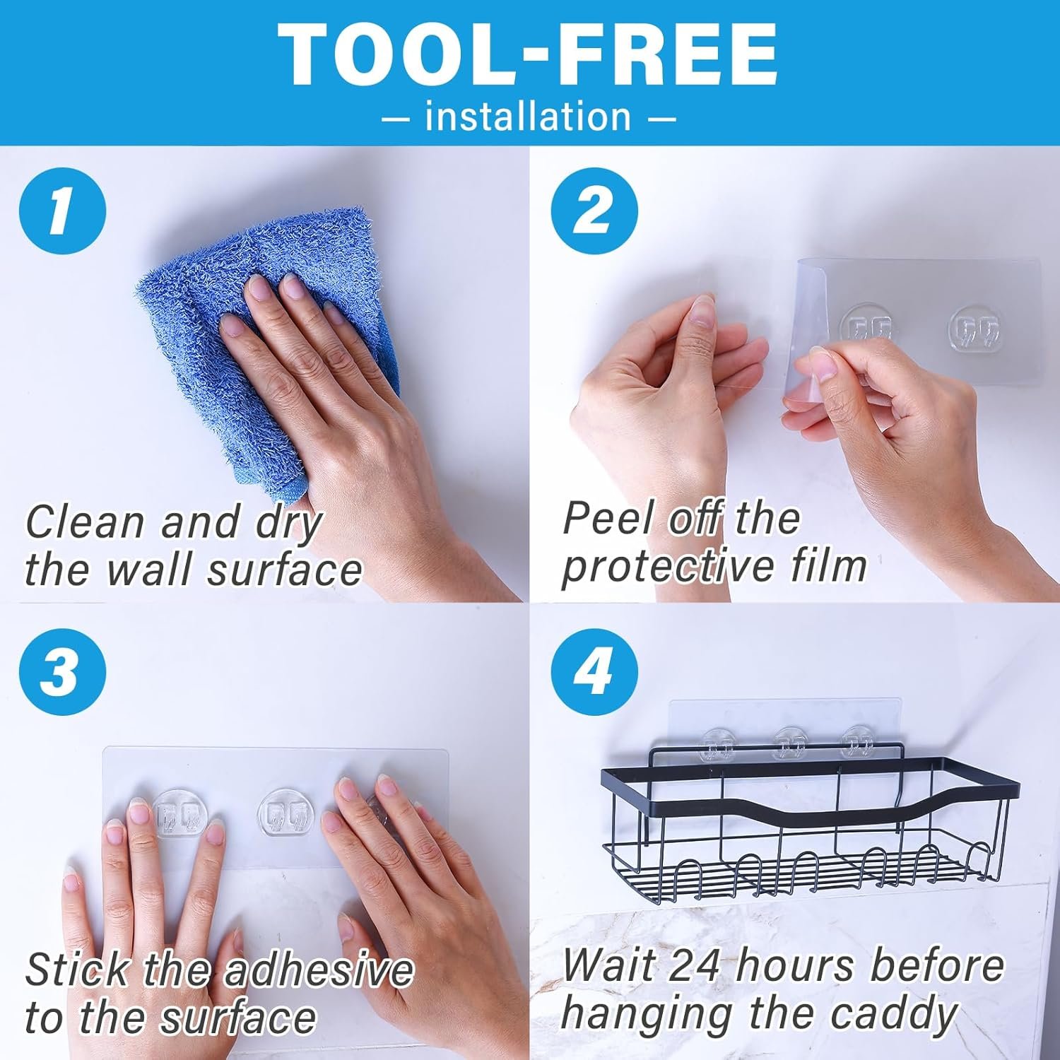 4 【Easy Installation】:Applicable to All Walls,Installation only takes a few minutes,requiring no drilling holes or any tools and doing no damage to the wall,Clean the surface before installing, stick the adhesive to the wall, and then hang the shower shelf to use it, you can buy it without worrying about it not working!