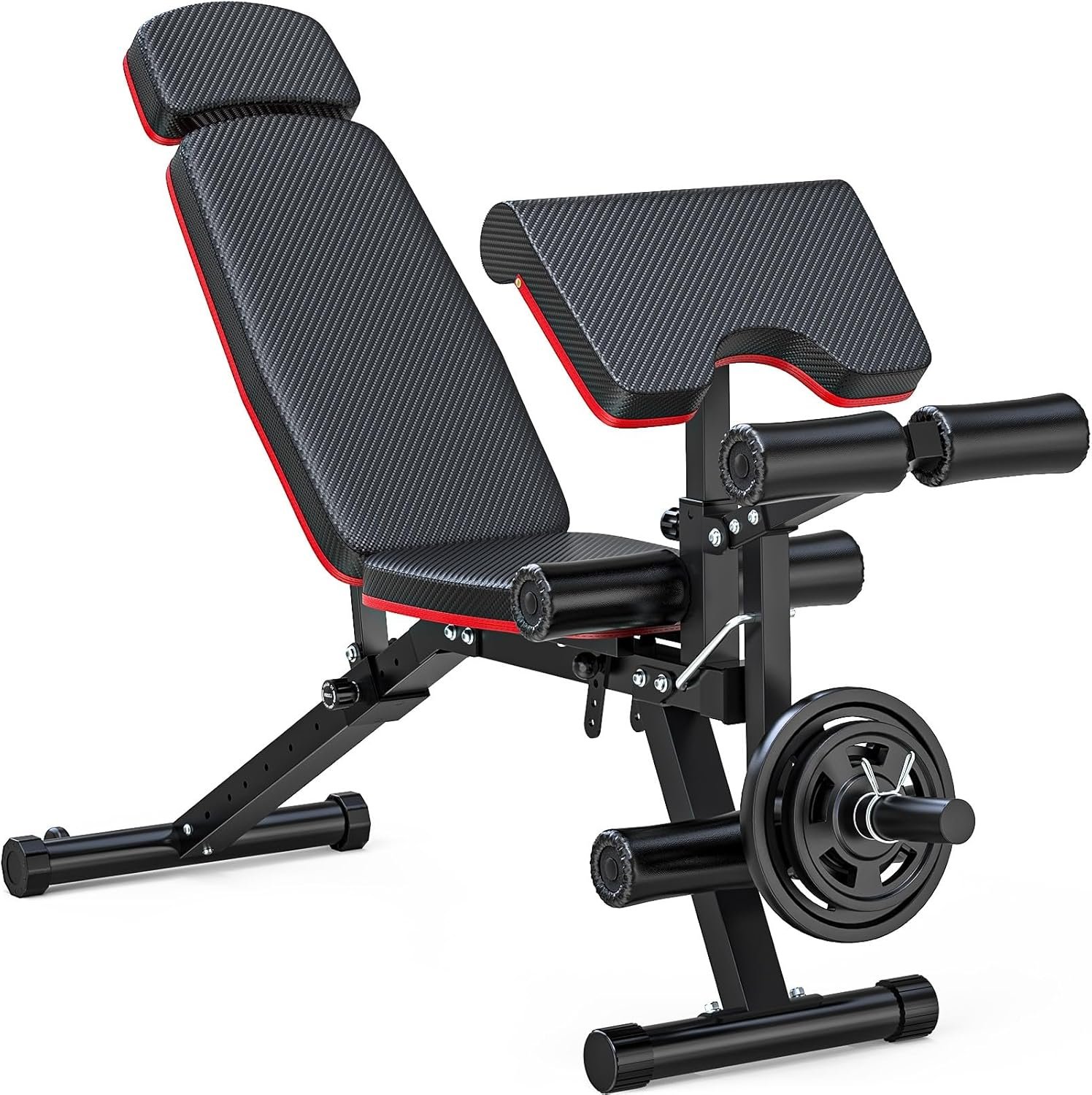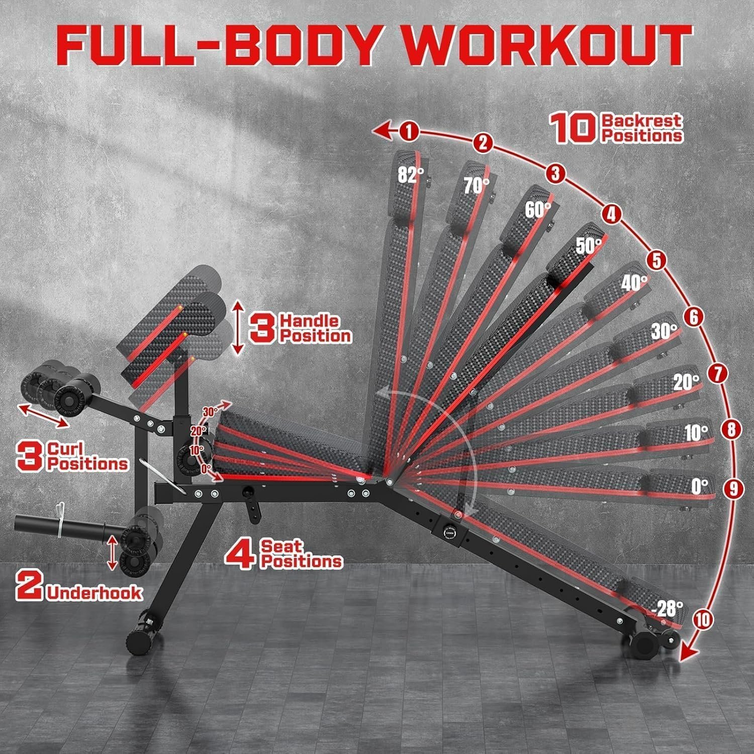 𝗔𝗗𝗝𝗨𝗦𝗧𝗔𝗕𝗟𝗘 𝗪𝗢𝗥𝗞𝗢𝗨𝗧 𝗕𝗘𝗡𝗖𝗛 𝗙𝗢𝗥 𝗛𝗢𝗠𝗘 𝗚𝗬𝗠: Our bench press bench features six adjustable parts: backrest, seat, headrest preacher pad, handles, and lower hook feet. This versatile fitness bench can be flexibly transformed into a flat, inclined, or lowered position according to your needs, providing you with a full range of body training experiences