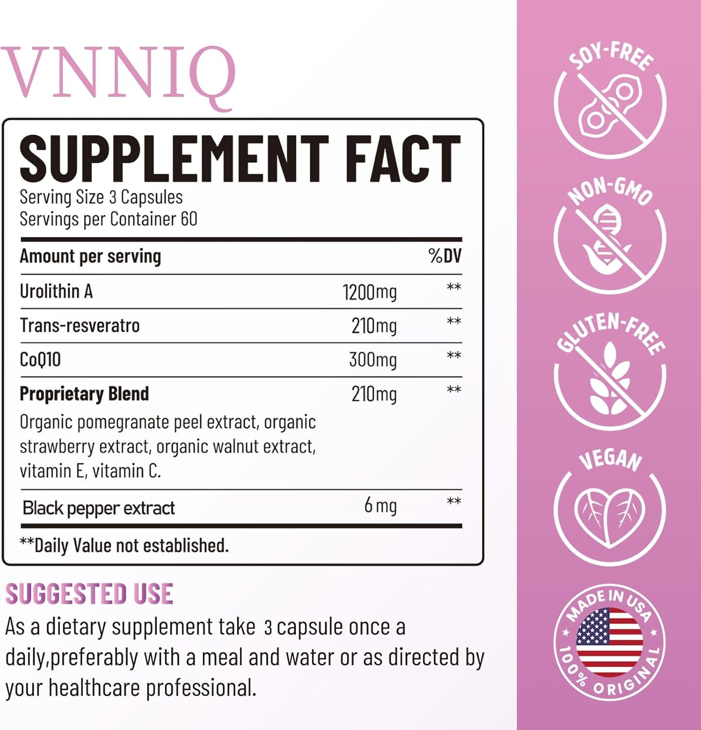 Take 3 capsules daily. You may likely notice a nuanced yet genuine improvement in your skin as days go by.