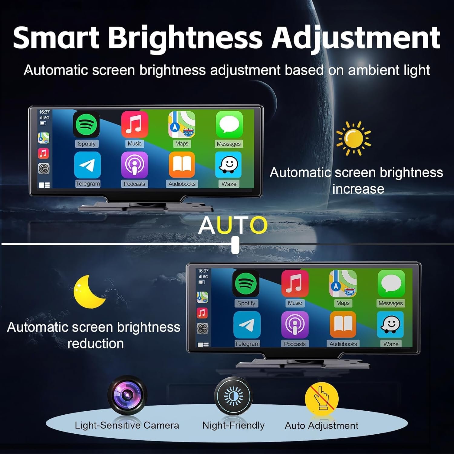 【Intelligent Brightness-Adjustable Touchscreen】 The Luzeterna Portable Apple CarPlay system features an adaptive light-sensing touchscreen. It intelligently senses day and night conditions, the function that can automatically adjust the screen brightness instead of manual adjustment ensures a driving experience free from discomfort and glare.