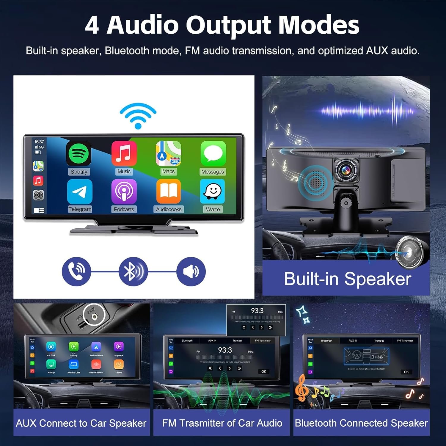 【4 audio outputs】1: Use the built-in speaker of the portable automotive Audio CarPlay to output the sound through the device. 2: Synchronize the FM frequency with the vehicle radio through the touch screen to achieve. 3: Plug the AUX cable into the vehicle’s original AUX port to output audio. 4: Connect iPhone and car radio via Bluetooth.Note that Bluetooth audio transfer is only available for CarPlay, not Android Auto.The last three methods can output audio through the original car speakers