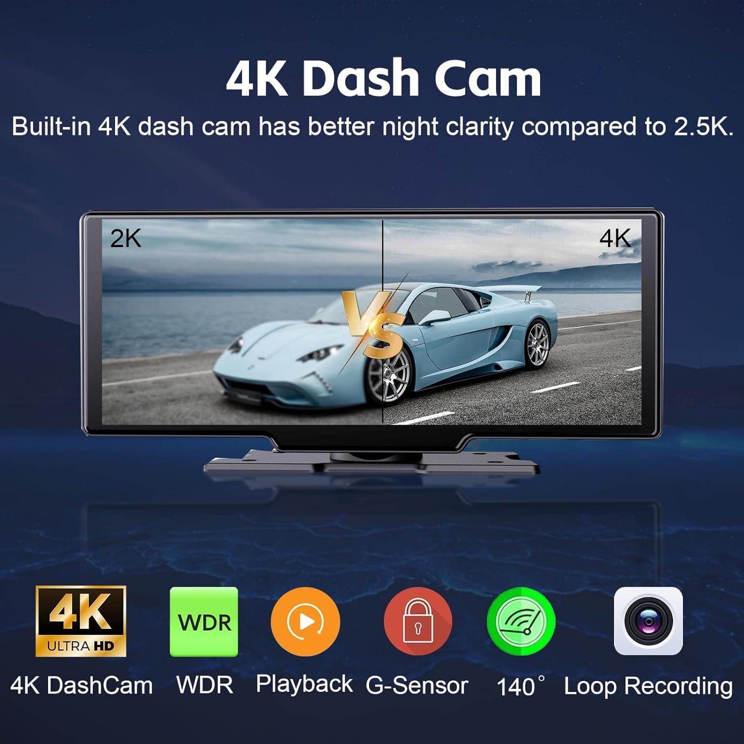 【4K Dashcam/Backup Camera】 Luzeterna portable car stereo, fully upgraded 4K dashcam with 1080P backup camera! No matter the day or night, it can record your journey and present it in excellent quality. The front and back dual recording features capture detail. The unique split screen display enables you to view the driving record and reverse image simultaneously, ensuring your driving safety.