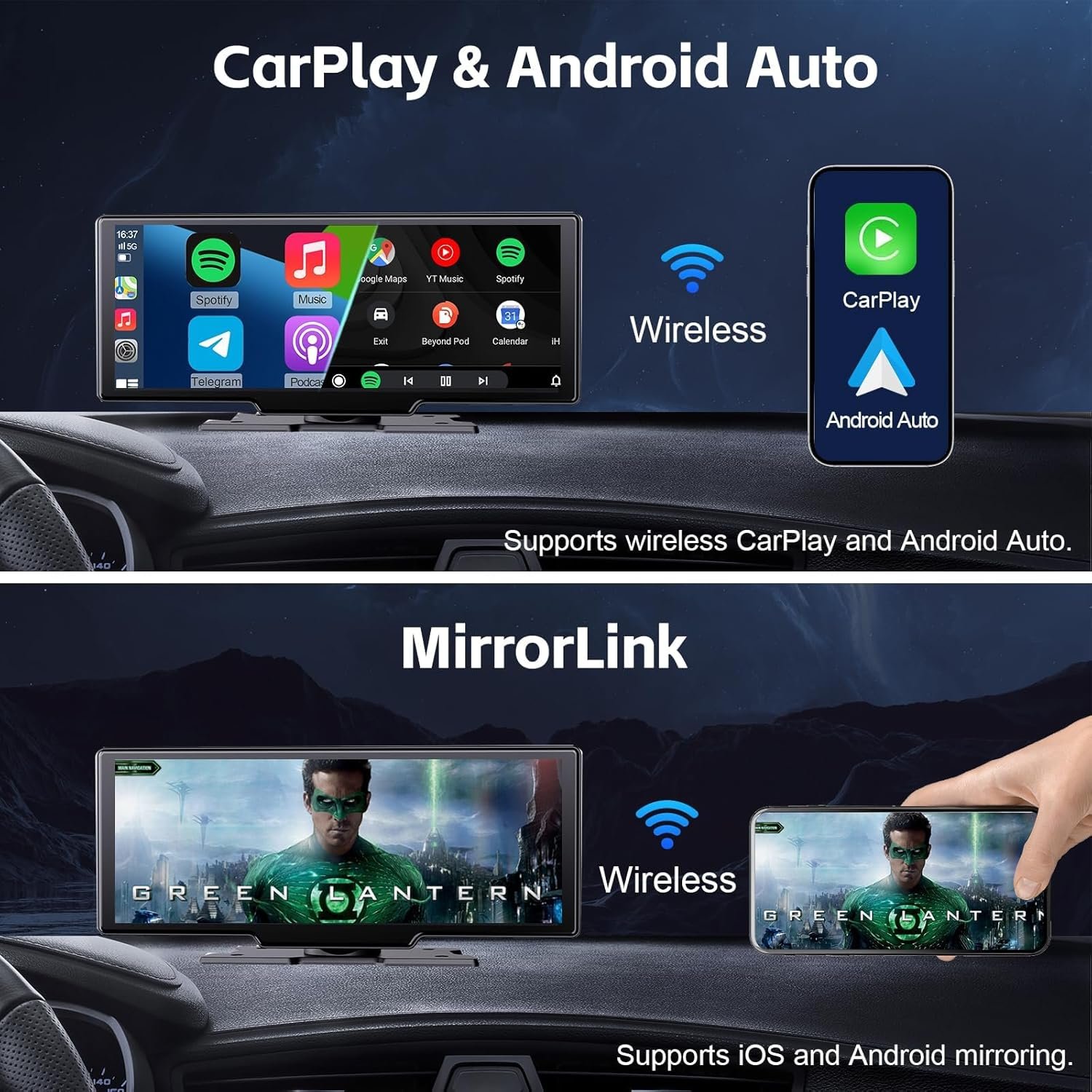 【Wireless Apple Car Play/Android Auto】With wireless CarPlay/Android Auto connectivity, you can easily use apps like Waze, Google Maps, Spotify and more. Siri/Google Assistant voice control for navigation, music playback and hands-free calling through bluetooth.