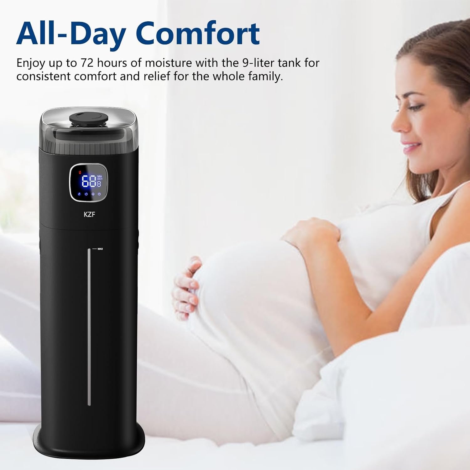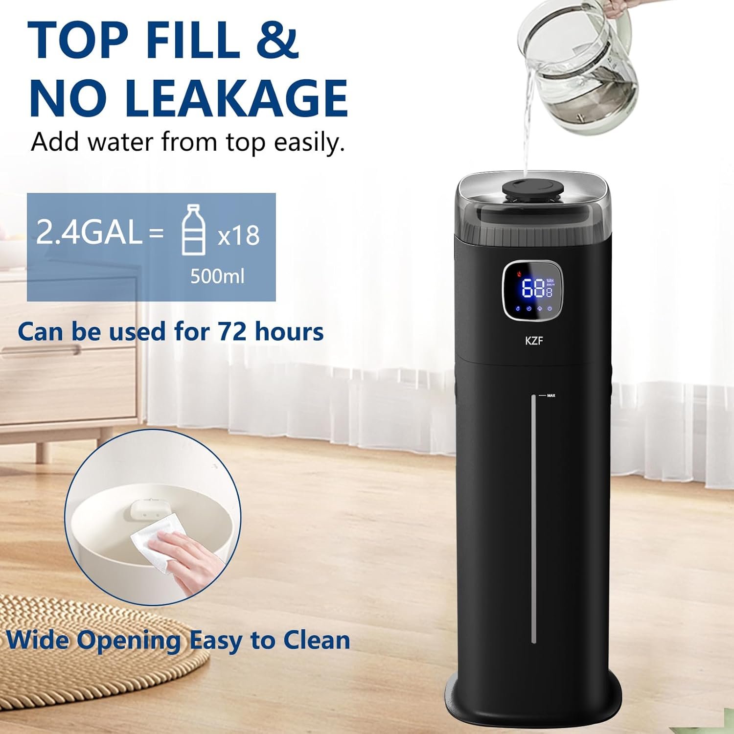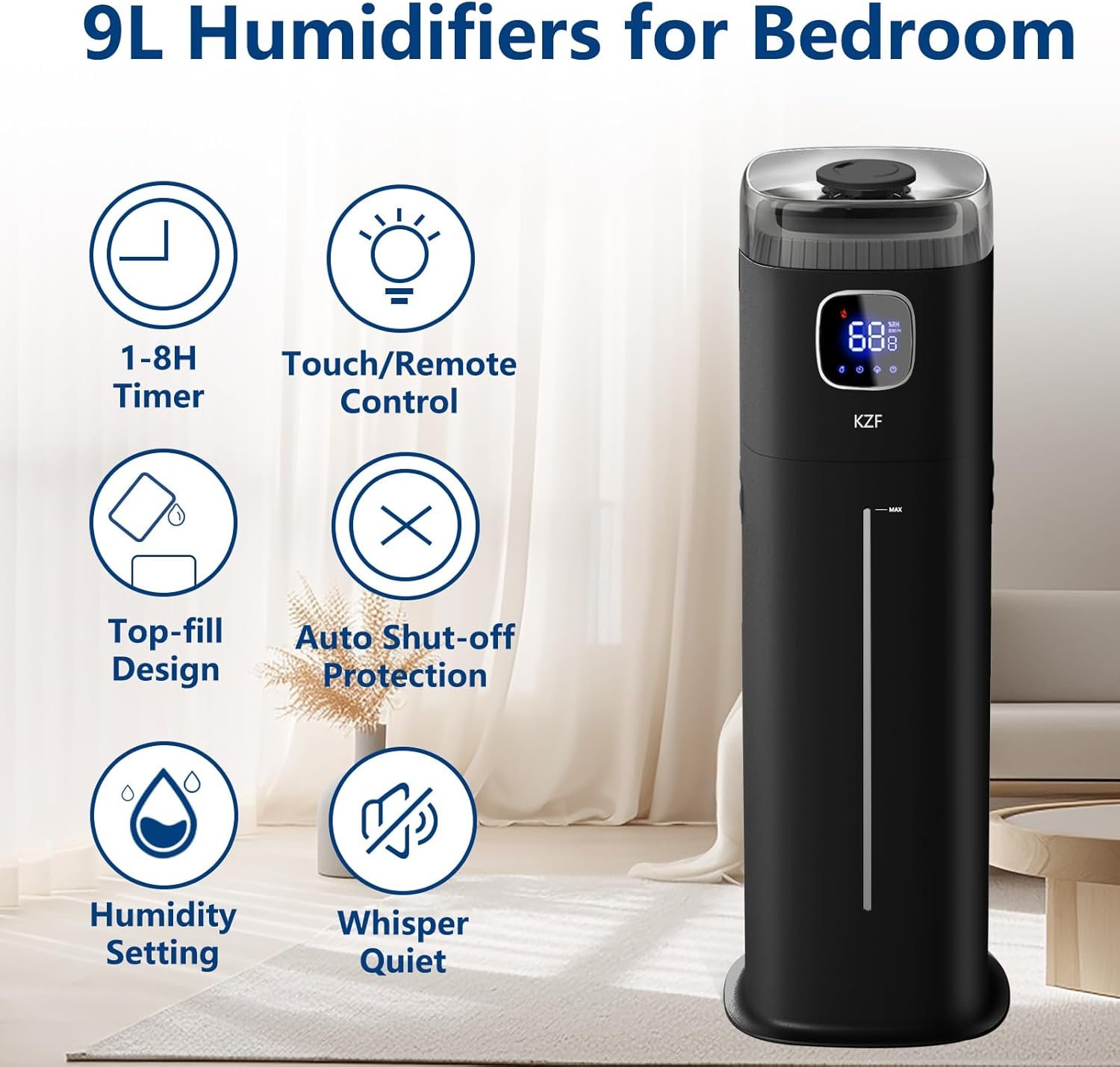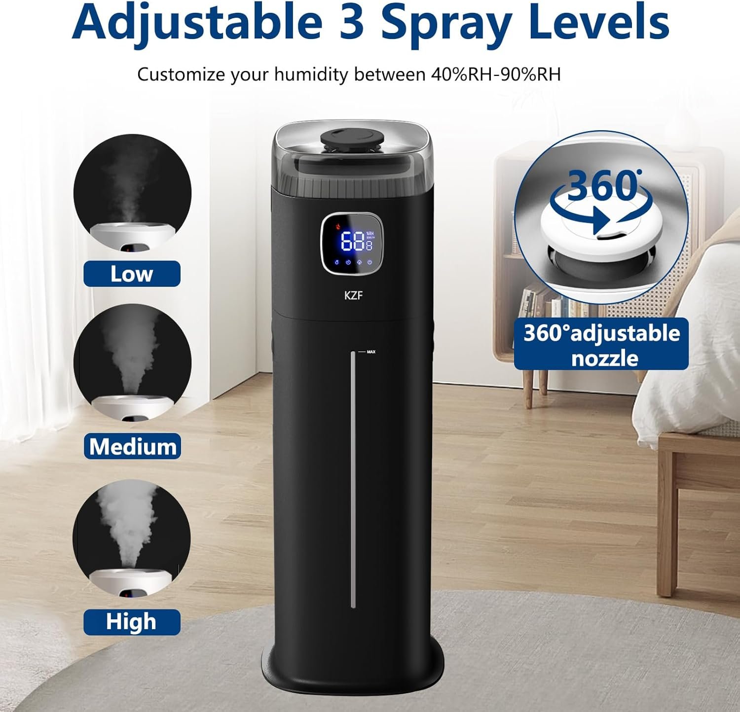 9L/2.5Gal Humidifier for Large Room Bedroom, KZF Ultrasonic Cool Mist Humidifier with Humidistat, 360°Nozzle, Last 72 Hours Suitable for Baby Home Indoor Plant (Black) (Black)