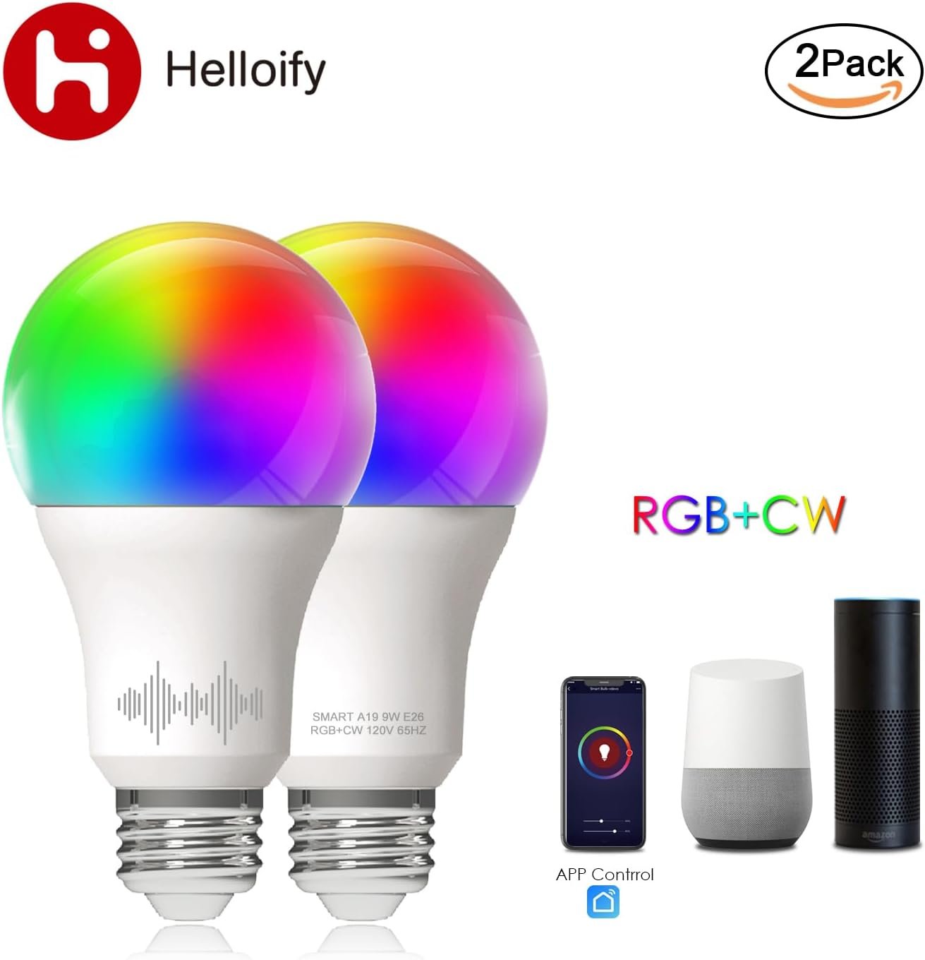 High Brightness LED Smart Bulb from Helloify — We always hear people complain that smart bulbs are not bright enough for colored light but Helloify smart bulbs always keep the high brightness 2700K to 6500k and 806lumens perfect for your requirements make home change with your mood Voice Control — Control Helloify smart bulb via your voice with Alexa and Assistant Just give a voice command to turn on/off or dim/brighten your light even switch your light to specified color as you need No hub required and easy to install No need subscription APP Remote Control — We hope to meet the various requires of consumers through simple APP operations Even you are not at home you can control your smart bulb on/off with your phone via Smart Life App Easily set schedule for your smart bulb Customize your home light system like setting lights to come on at dusk or turn off at sunrise You can create a group for all of your smart bulb and control them all with just one command Works with 2 4GHz Wi-Fi network Energy Saving Wide Usage — With LED technology this bulb will save up to 80% energy consumption compared with ordinary bulb Save your electricity charge with newest lighting technology This bulb can be used on anywhere you need colorful light such as home indoor lighting hotel meeting room museum restaurants bar cafe holiday decoration birthday party What you get? — Over 15,000 hours lifetime with normal use This bulb has FCC CE RoHs certificate 9 Watts (equivalent of a 60W traditional incandescent bulb) 806 lumen Voltage Range AC 110/120V 50/60 Hz We have the detailed APP installation instructions for Android and iOS systems in box package include 2 pack smart bulb 1 x instructions manual Please note smart bulb is not match with dimmer becasue it can be dimmable itself you should remove the dimmer before installing the bulb