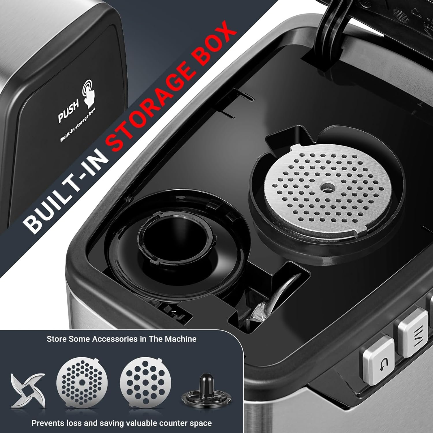 𝐓𝐫𝐢𝐩𝐥𝐞 𝐒𝐩𝐞𝐞𝐝 𝐀𝐝𝐣𝐮𝐬𝐭𝐦𝐞𝐧𝐭 𝐅𝐨𝐫 𝐅𝐥𝐞𝐱𝐢𝐛𝐥𝐞 𝐂𝐨𝐧𝐭𝐫𝐨𝐥:Advanced meat grinder features triple speed: High 195RPM for tough and frozen meats, Low 180RPM preserves soft food’s taste, Reverse prevent clogs. Efficient and versatile.Optimizes space with built-in storage box, keeps tidy