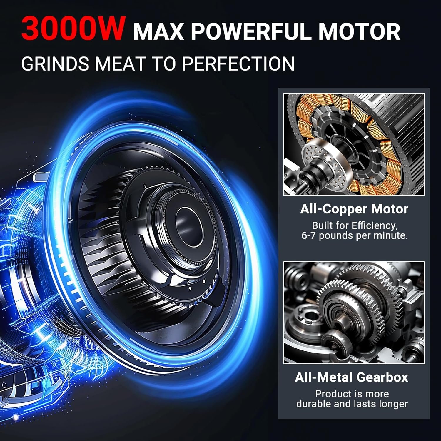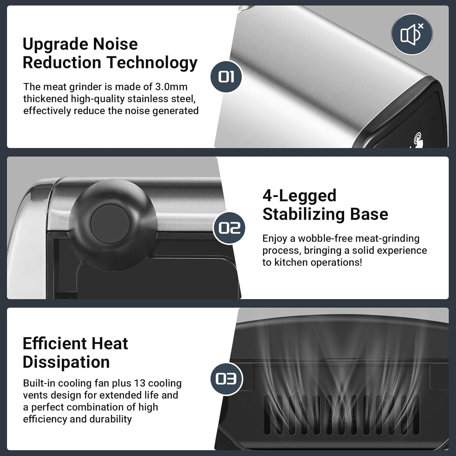 𝐃𝐨𝐮𝐛𝐥𝐞 𝐆𝐮𝐚𝐫𝐚𝐧𝐭𝐞𝐞 𝐨𝐟 𝐌𝐚𝐢𝐧𝐭𝐚𝐧𝐜𝐞 𝐚𝐧𝐝 𝐒𝐭𝐚𝐛𝐢𝐥𝐢𝐭𝐲: Built with 13 cooling holes and an air-cooled plus fan, our meat grinder heavy duty is designed for rapid heat dissipation, nearly doubling its lifespan. A four-legged base ensures stable grinding. Innovative safety techs like overheating and overcurrent protection for long life and low maintenance costs