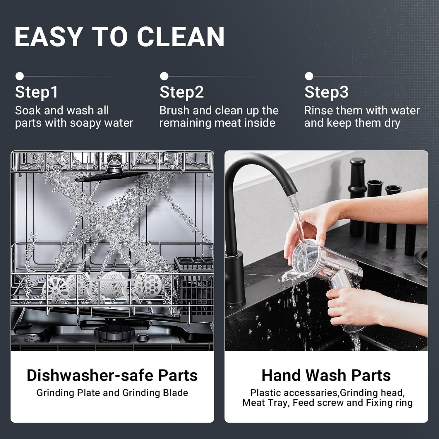 𝐏𝐞𝐫𝐟𝐞𝐜𝐭 𝐁𝐥𝐞𝐧𝐝 𝐨𝐟 𝐃𝐮𝐫𝐚𝐛𝐢𝐥𝐢𝐭𝐲 𝐚𝐧𝐝 𝐐𝐮𝐢𝐞𝐭𝐧𝐞𝐬𝐬: Our upgraded all-metal gearbox meat grinder for durability and quietness. 3mm stainless steel shell insulates noise during operation, easy to clean. All parts can be disassembled for hand wash, Hand wash and wipe with a cloth to prevent oxidation of alloy parts. Dishwasher-safe blades and plates