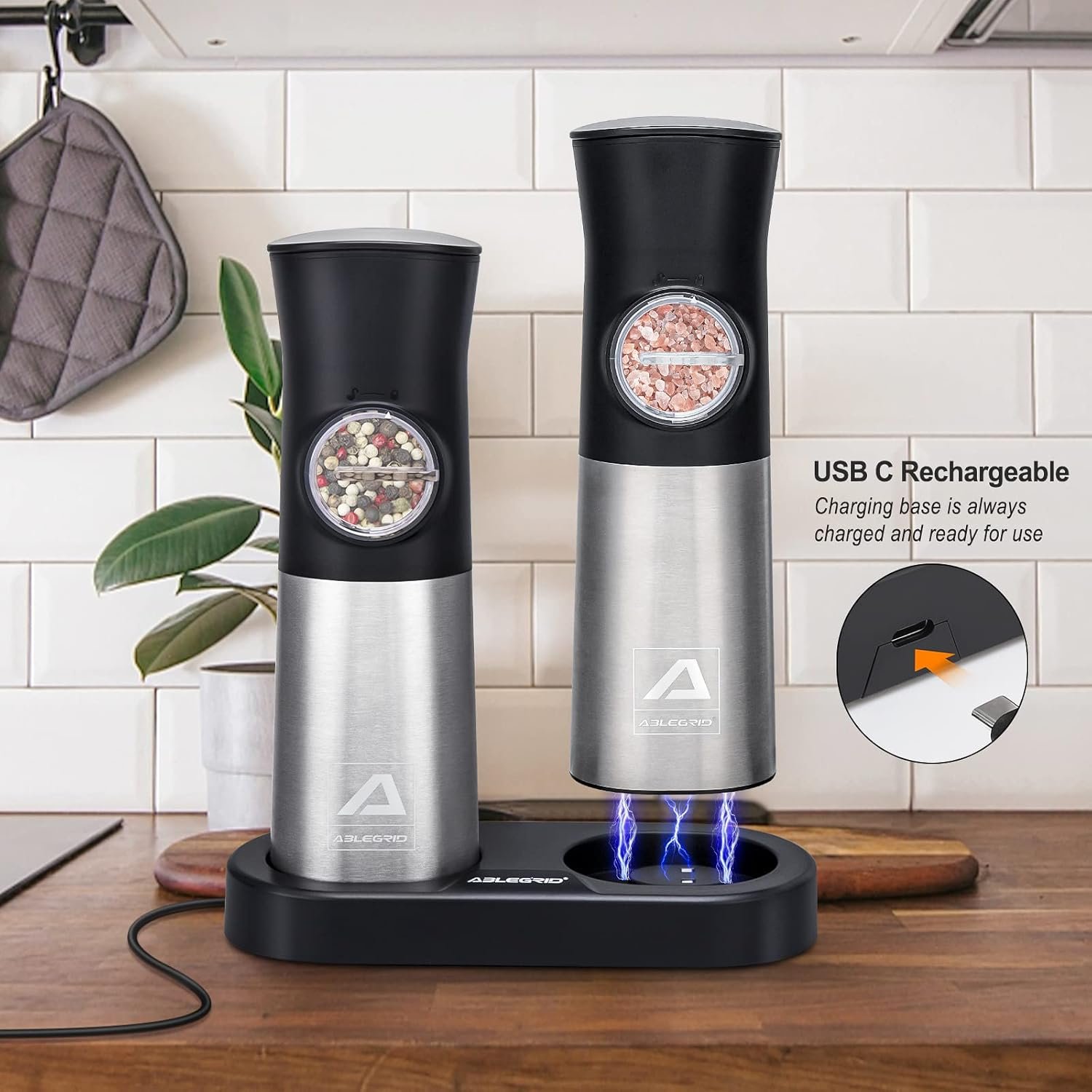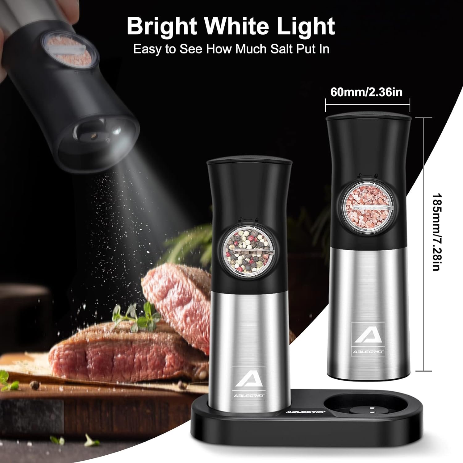Food safe material and LED light: ABLEGRID electric Salt and pepper grinder set, combination of ABS plastic and stainless steel, more classy, not easy to damage. Grinding head is on top, so the powder is not easy to fall. The dust cover prevents dust and seasoning from getting wet. LED indicator lights up when grinding, so that you can clearly see the amount poured in the dark to prevent over-seasoning.