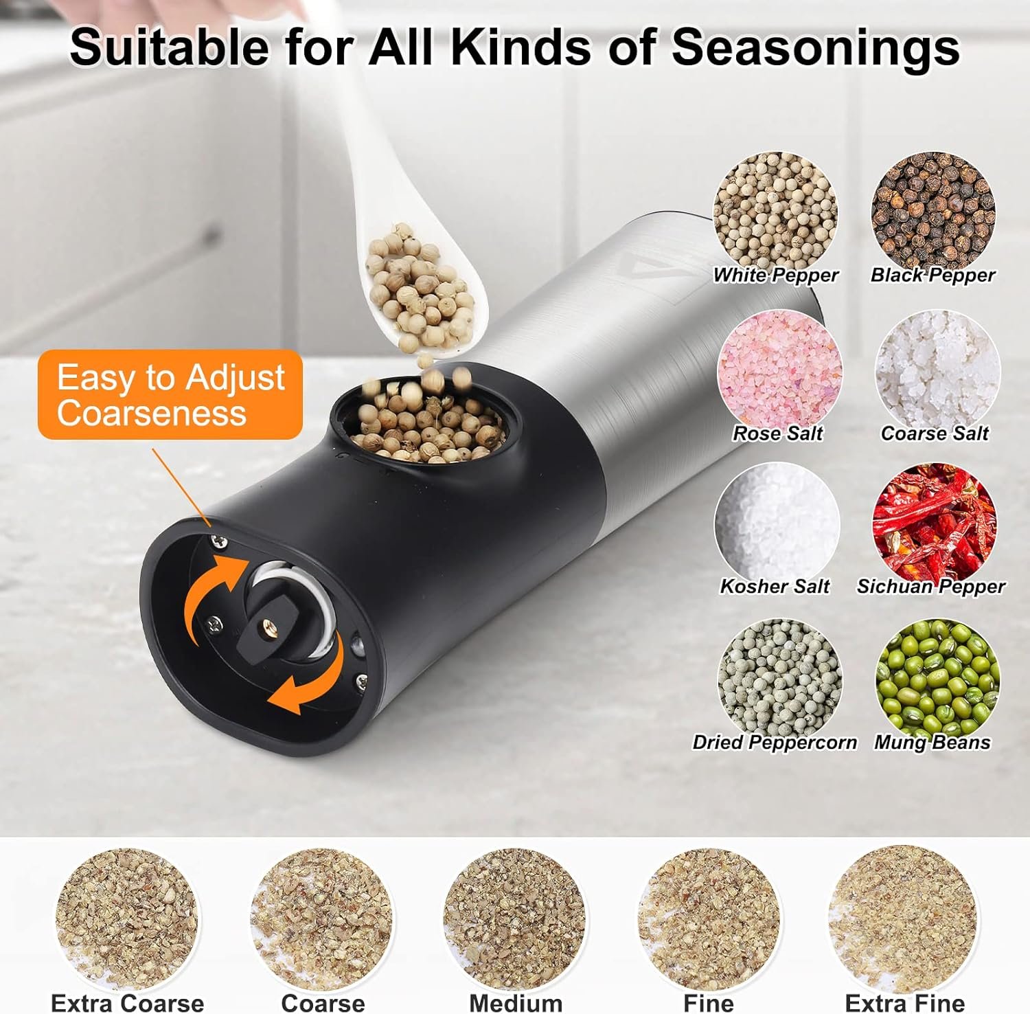 Gravity-sensitive one-hand operation:Electric salt and pepper grinder set, gravity-sensitive grinding, without pressing a button, just flipping the grinder, you can get freshly seasoned easily. One pepper mill, one salt grinder, a set to solve the problem of seasoning grinding.