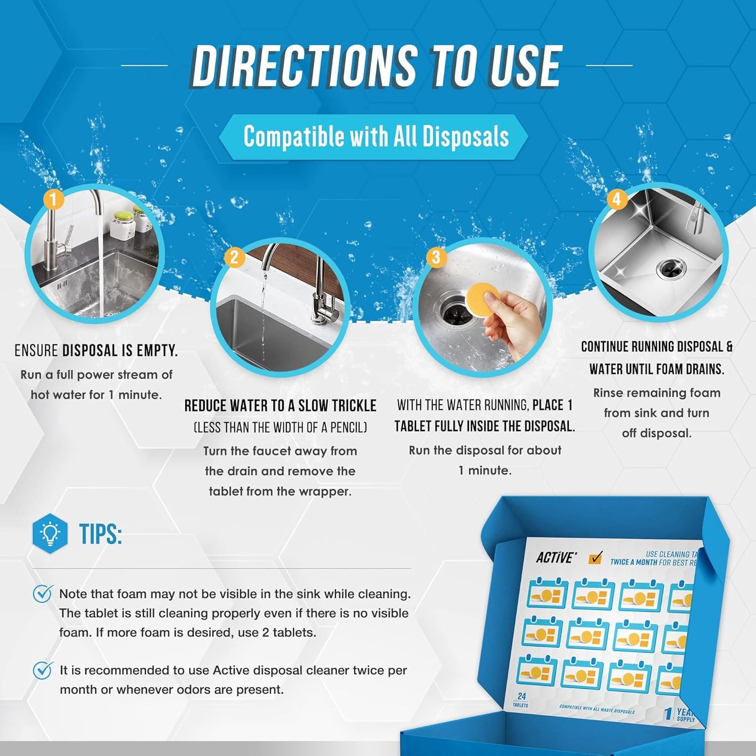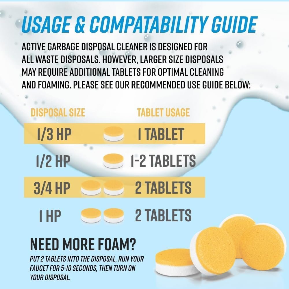Use Instructions: Add one tablet into your disposal and run your faucent at a light trickle for 5-10 seconds, then turn on your disposal. Keep the faucet on until the foam is gone. if more fom is desired or for larger disposal units, we recommend 2 tablets
