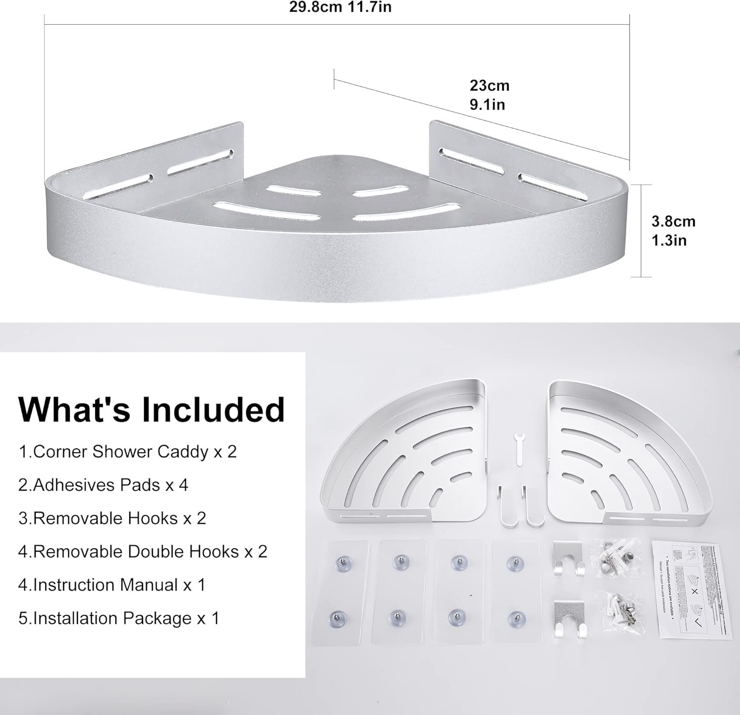 【2-Pack with 4 hooks】2-pack Bathroom shower organizer provide large space for your shampoo and other bathroom products. Features 4 removable hooks that not only help you store your razor but also hang your washcloth or shower brush.
